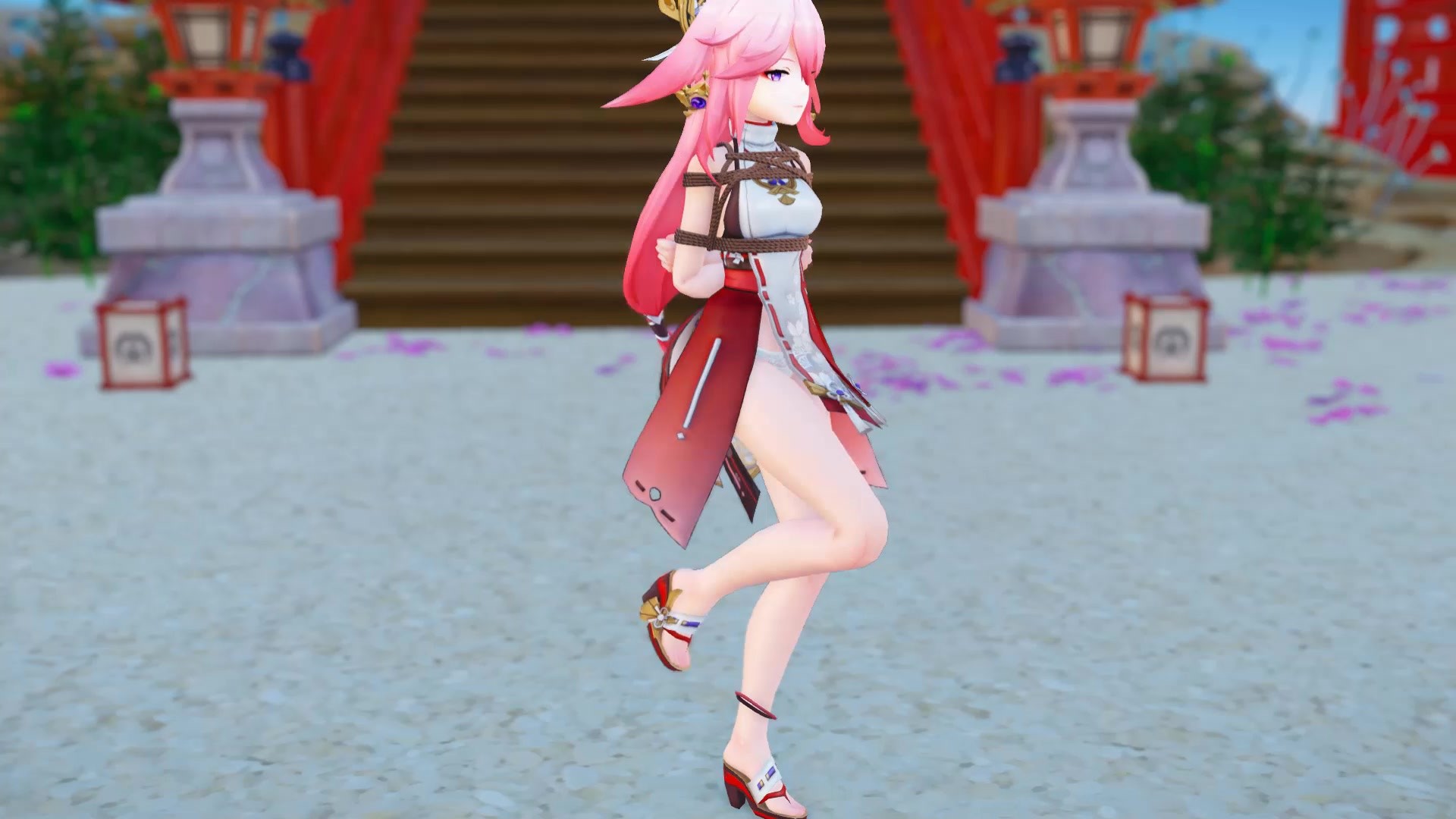 内容:第一幕是八重神子被绑在神社的柱子上,第二幕是八重神子穿着白色泳衣被绑在神社柱子上,第三幕被绑在十字架上,第四幕是拘束舞蹈