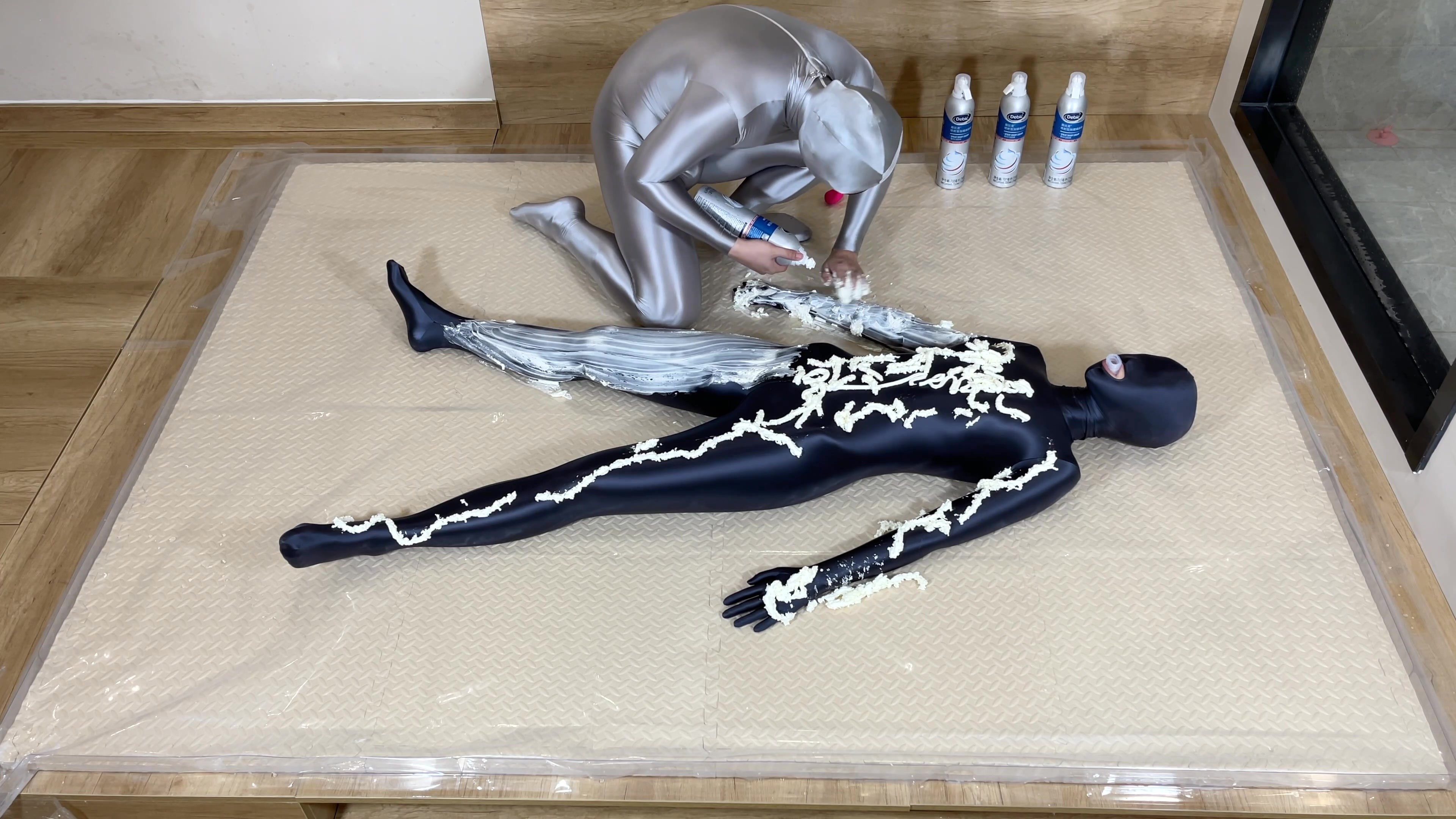凌风身穿zentai平躺在地上,被混身喷满奶油。