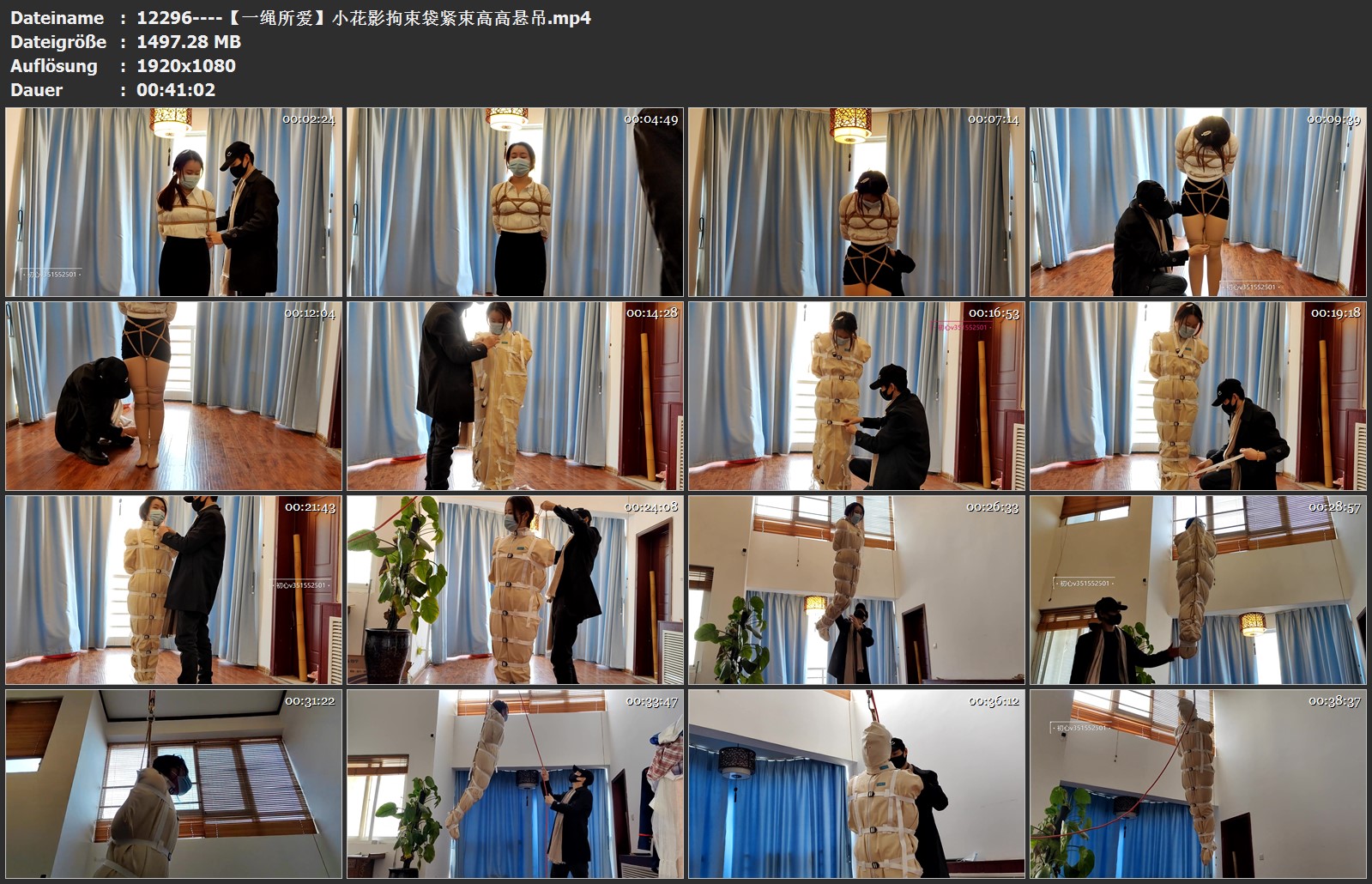 小花影麻绳捆绑,装进拘束袋,紧紧束缚起来,高高悬空吊起来,棍棒击打,放置,头套束缚