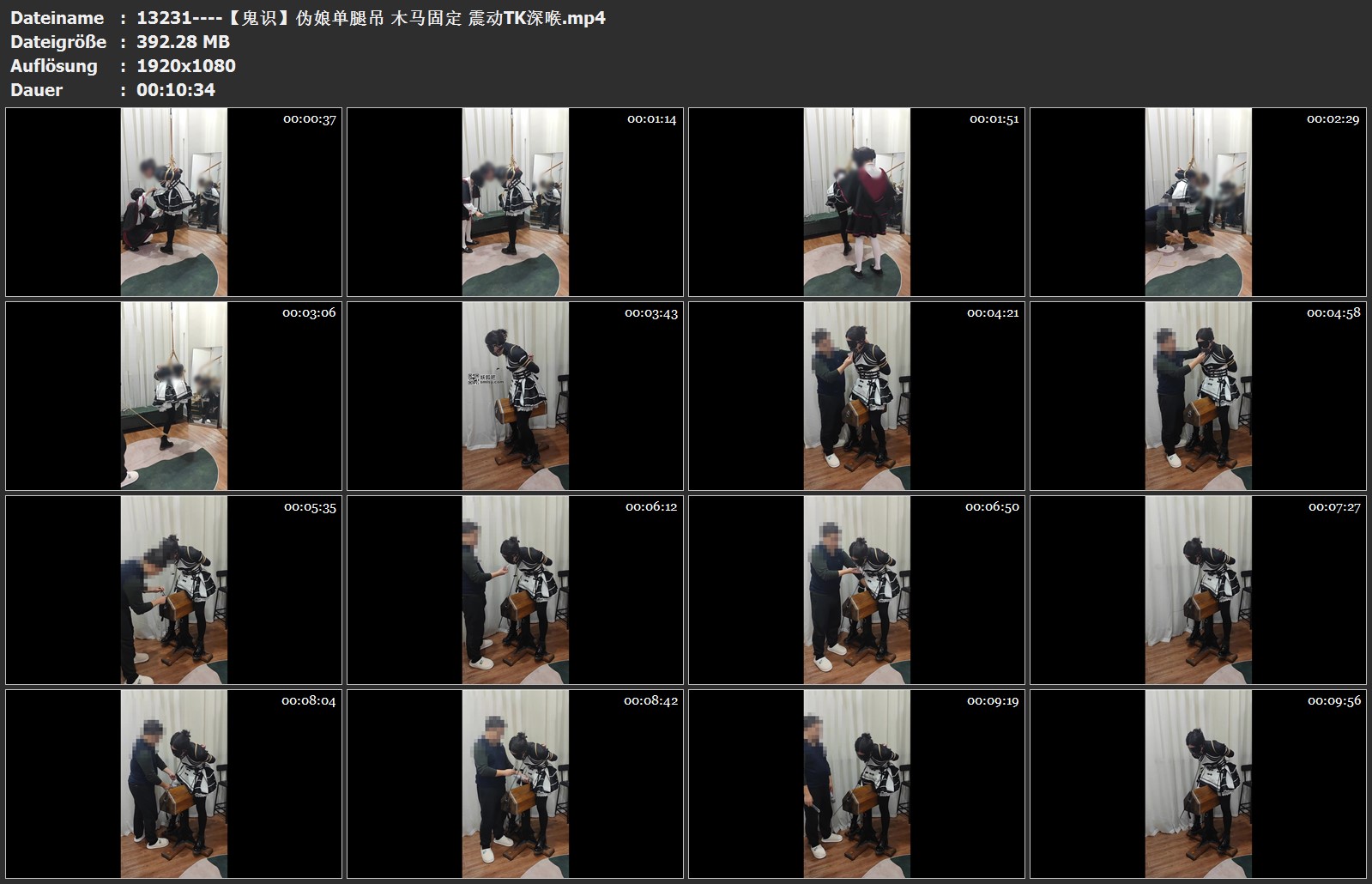 第二段是木马骑坐,双脚脚踝用扎带固定在木马底座上了(因为鞋子是黑的大概看不太清),后面还把项圈锁在木马上。玩法是开口器硅胶棒深喉,以及边深喉边震动