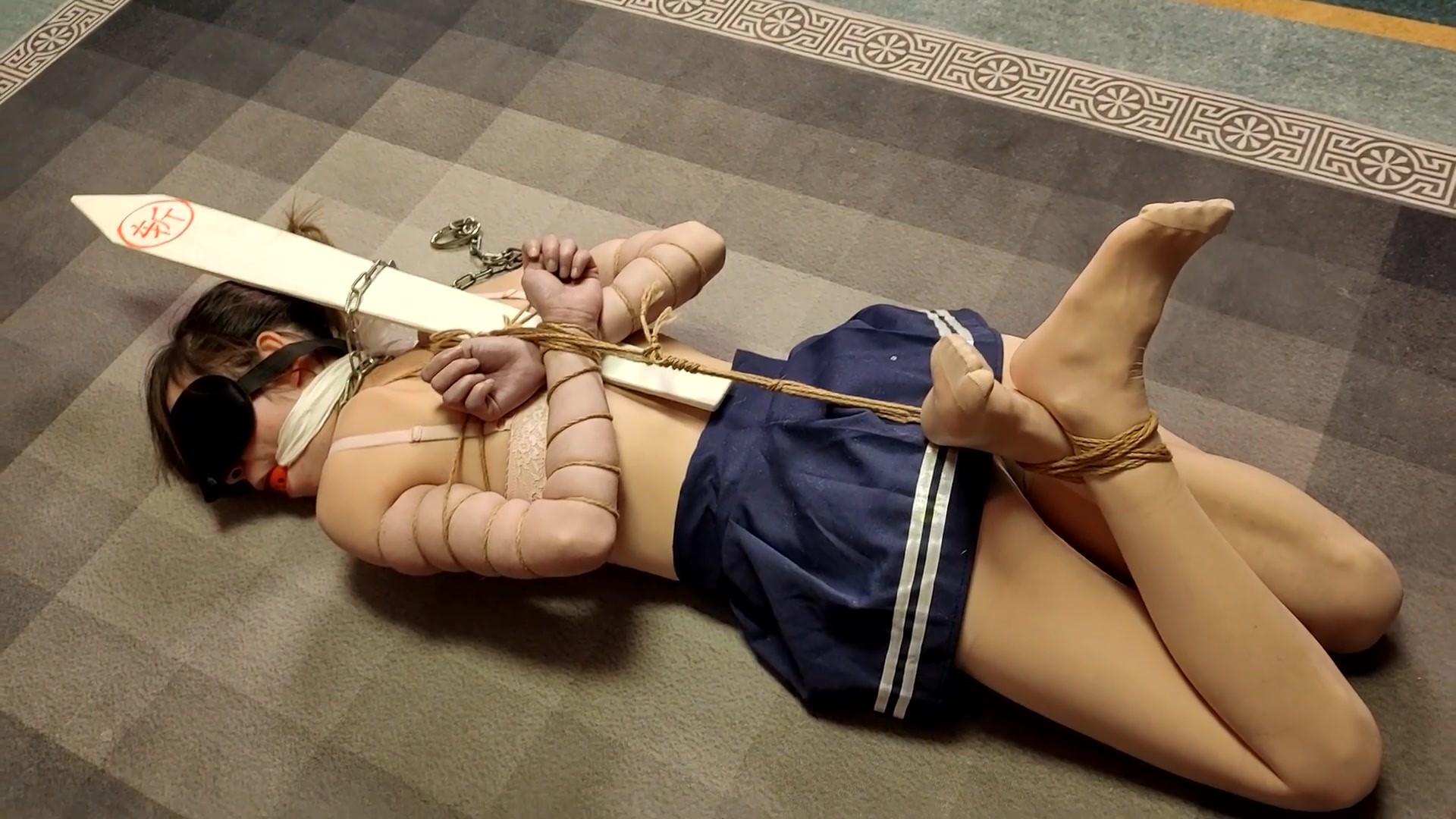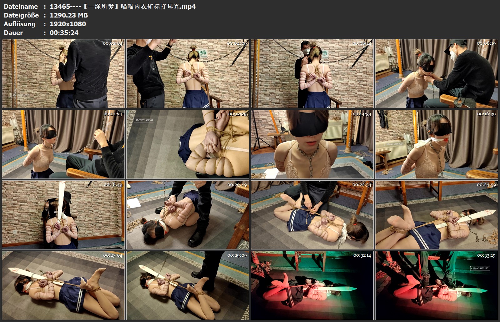 喵喵身着内衣,细腻的皮肤被麻绳紧紧捆绑,手腕被高高提起,锁上铁链项圈,身上插上斩标,被打耳光教训,最后驷马紧紧绑起来,踩在脚下,黑暗中放置