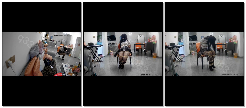 这个周末的丫丫是完全测底的失去自由了。,大叔最近喜欢上了捆绑放置,于是把丫丫绑好了骗她说出去买点东西,一会就回来,谁知道这一出门就是8个小时!给大家剪切2个小时的监控内容吧,中午12点大叔把她绑好之后,这次不一样的是直接黑胶布蒙眼,避免她睁开,堵嘴依然是丝袜最里面,口球第二,黑胶布最外面貼得紧紧的!完事过后,丫丫彻底的失去了感知器官!大叔用了3个不同角度的监控器位置放好,还留了一台手机正面拍摄在家中,4台设备全方位开机,,塞上蛋蛋,固定好棒子之后中午12点过出门了!!!可惜的是棒子最多只能振2个小时不到,不过已经够了,8点过的时候大叔差不多办完事情准备回来了才突然想起家里还有一只被捆绑的m,,,,匆匆忙忙赶回家之后丫丫已经尿了不知道几次了,地上全是液体,,整个下午估计就是挣扎,呜呜呜,失禁,反反复复!勤快的大叔赶紧打扫战场,!整理干净之后没有决定马上放过丫丫,而是继续调教