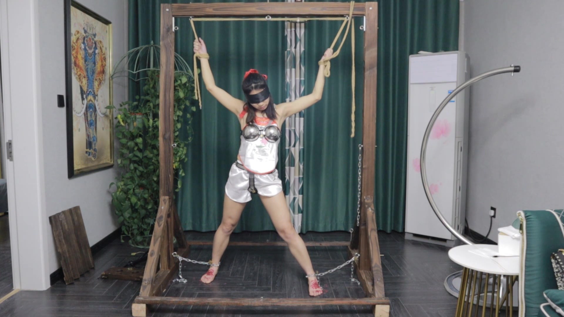 下集 美丽的新娘被五花大枷锁上木枷罚跪在三角木上,特别痛苦 大字型捆绑 扒下长裙 只剩肚兜 强行锁上贞操锁调戏 押到卫生间手铐锁起过夜等