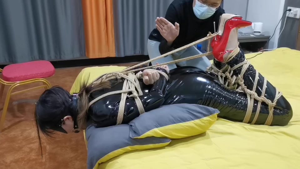 【雯莹莹】小雯皮衣超高跟开腿紧缚,眼罩口球 口塞,强制GC,海老缚放置,驷马口J