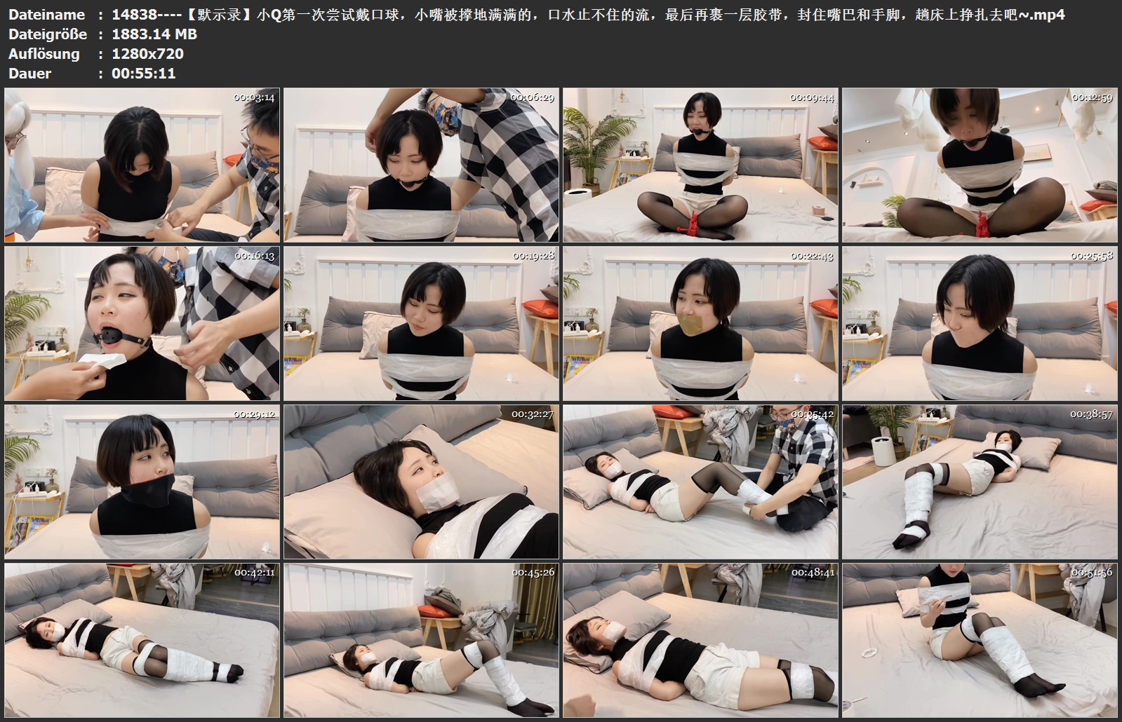 【默示录】小Q第一次尝试戴口球,小嘴被撑地满满的,口水止不住的流,最后再裹一层胶带,封住嘴巴和手脚,趟床上挣扎去吧~