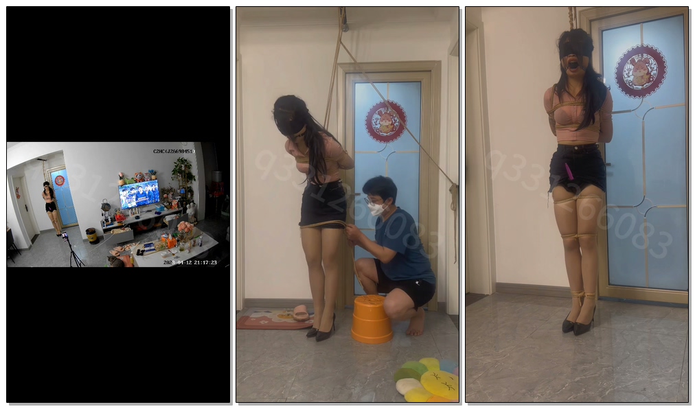 又来一部监控放置,这次是日式吊缚高跟鞋罚站,最近的定拍客户是花样百出,要求高跟鞋里面放红豆,,,疼的丫丫差点崩溃,,吊好离开之后,就听见监控里一直大叫,,感觉整栋楼都听到了,,,本来想放一张小板凳的,结果跟太细,板凳都被踩穿了!这样的吊缚也不敢太久,确实受不了,一个多小时的样子大叔就打道回府了,然后,,给她披上外套,带上了天台