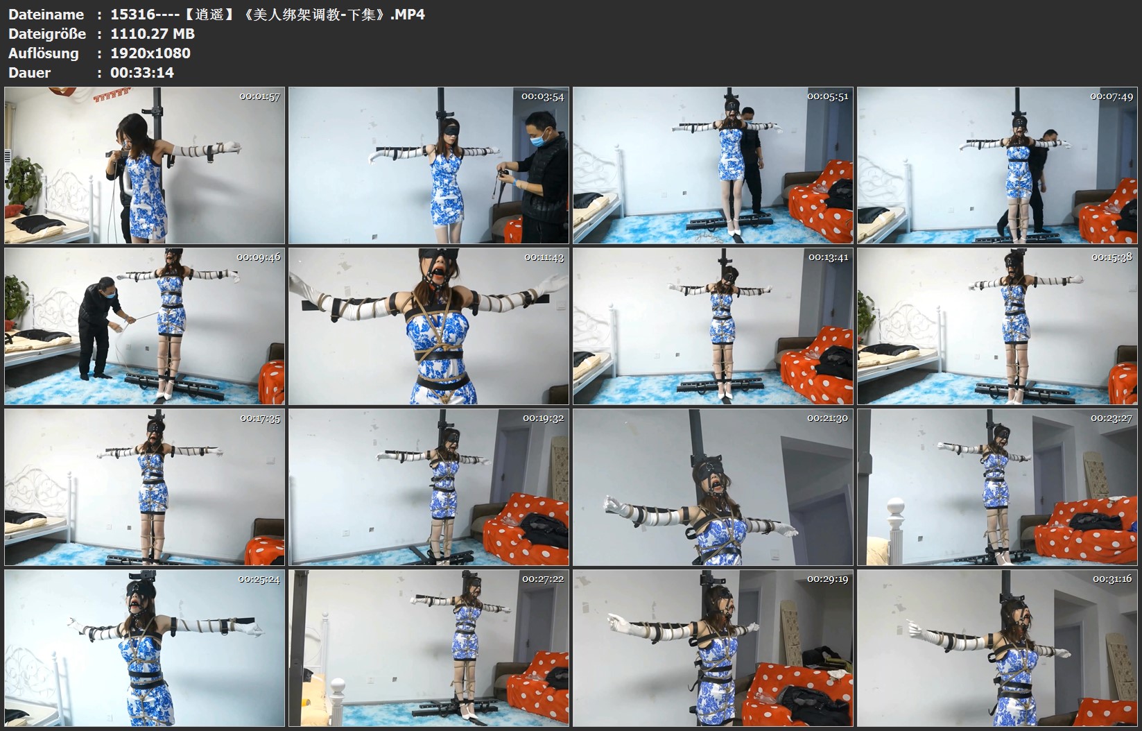 下集紧缚感继续升级,绳子和皮带一齐用上,全身只有双手还能挣扎。戴上眼罩和马具式口球后只能小姐姐只能唔唔叫,口水不断。