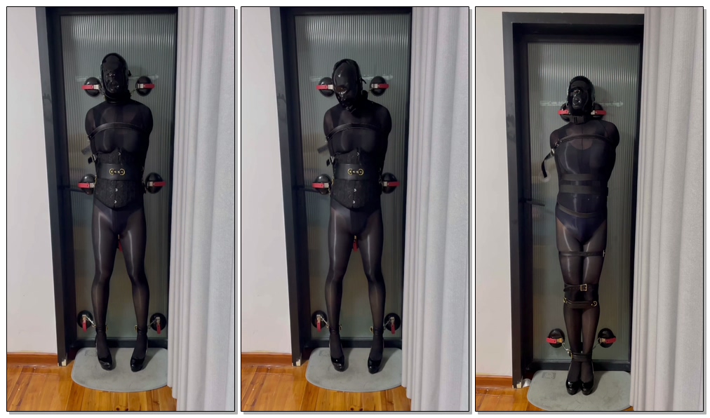 睡觉前小伪娘穿上全包黑丝和高跟鞋,带上乳胶头套蒙上双眼塞上口塞。再将自己用强力吸盘锁在门上。接着边只能无助的扭动身体不断被身上的小玩具调戏