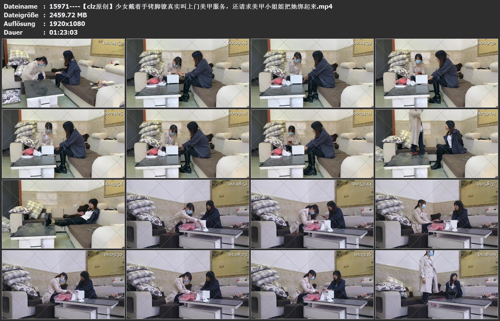 喜欢镣铐的少女,喜欢带镣铐生活,这天心血来潮,叫了美甲师上门服务,美甲师是真美甲师,不是演员,中途还叫美甲师帮忙把自己捆绑起来,双机位拍摄,这是上集,下集是真按摩师上门服务,并把少女捆绑起来!