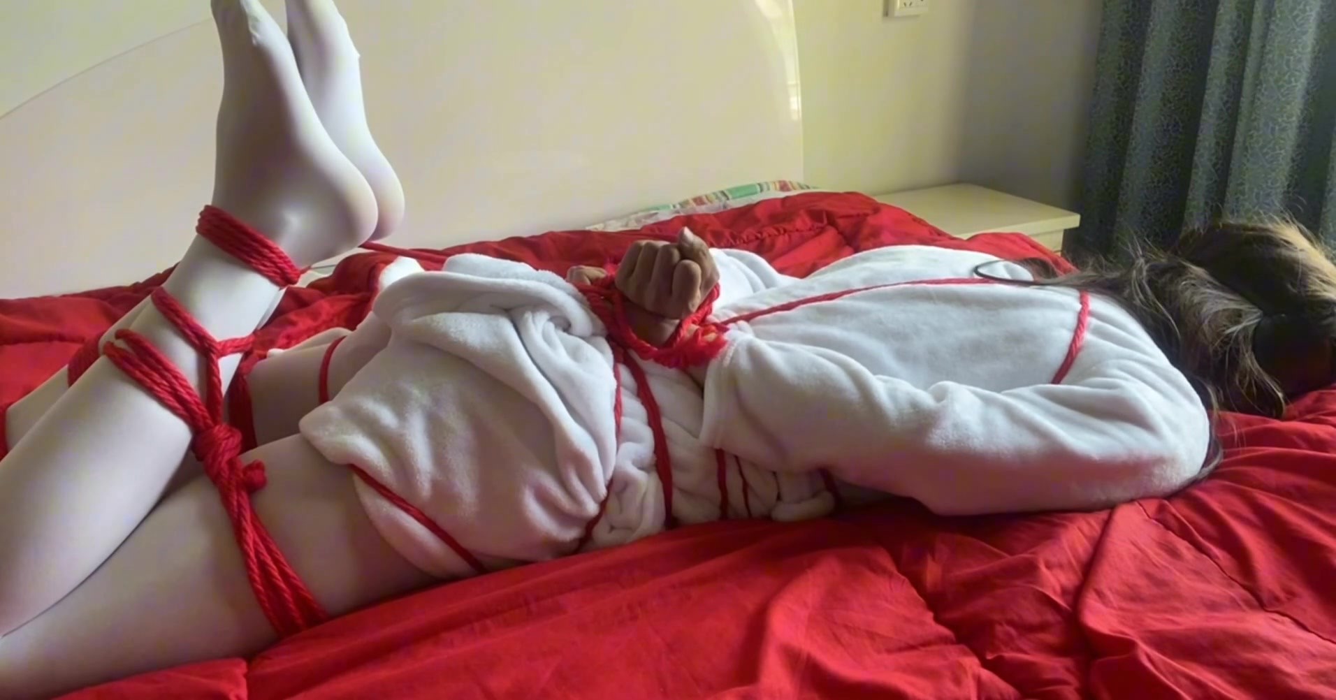 白色睡衣加白丝被M字捆绑,一只被固定,一只绳子短了没法固定,来回扭动,又接着被棒棒榨汁,之后又M字加驷马后手縛反绑在床上放置,差点解不开…最后就是腿部蛇縛超级紧无法挣扎开,再加上绑绑固定接二连三的榨汁…累坏了