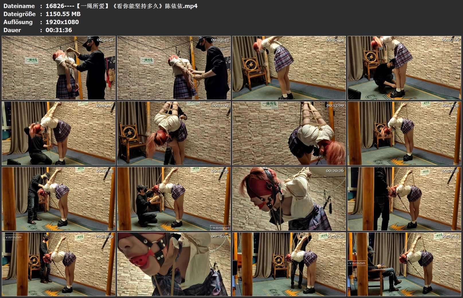 陈依依被欧式直臂,双腿交叉吊在屋顶上,一个很难受的姿势放置。看看她能坚持多久