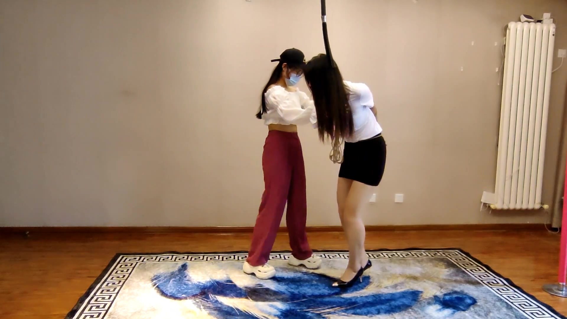 三个女孩一台戏,一个被绑起来,一个绑人和打人,一个拍摄出鬼点子,还挺像那么回事