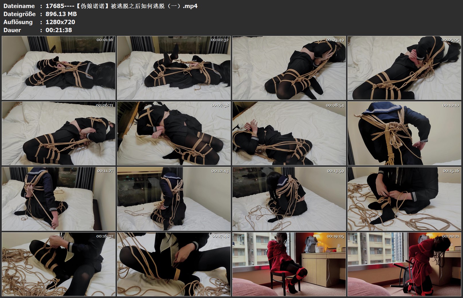 两段诺诺被捆绑起来后奋力尝试挣脱的片段,一段驷马一段椅子缚,穿着不同风格的水手服。过程绝对模拟真实被绑架的状态,捆绑严厉无放水,诺诺也是很真实地代入了被绑架的场景,全力和身上的绳子进行了斗争,最终依靠自己的努力成功逃脱~