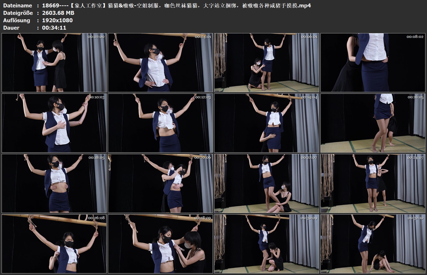 【象人工作室】猫猫&嗷嗷-空姐制服,咖色丝袜猫猫,大字站立捆绑,被嗷嗷各种咸猪手摸摸