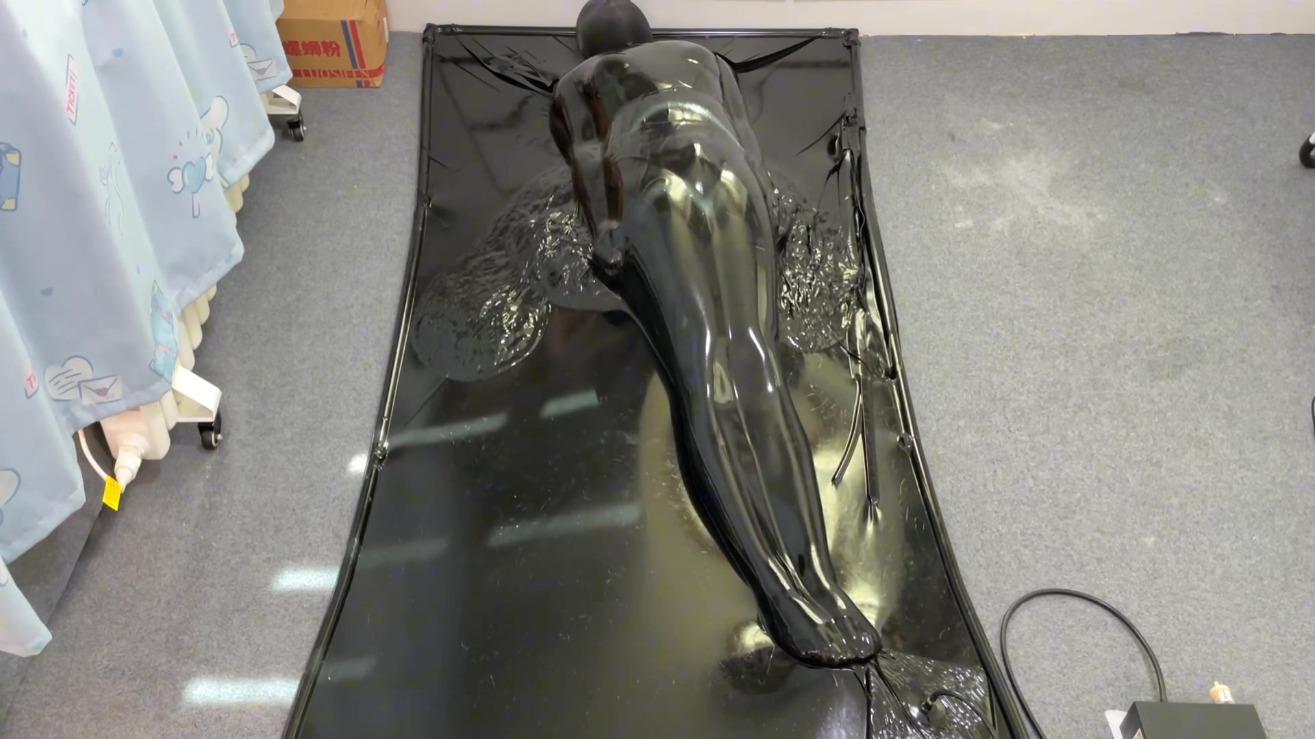 最近入手了一款新的真空床,将两边的管子换成了不锈钢的,同时换上了吸力更强的抽气机。可以不间断的向外抽气,密封性也更强的多,小伪娘还特地多放了一个大抱枕进去保证可以吸的更紧密,可以进一步的减少活动的范围.同时这次换成了露头款的,可以保证单人操作的安全性。当然还可以眼睁睁欣赏着自己包裹着3层全包丝袜的身体被紧紧的禁锢在这真空床中,丝毫动弹不得.却又无能为力.....