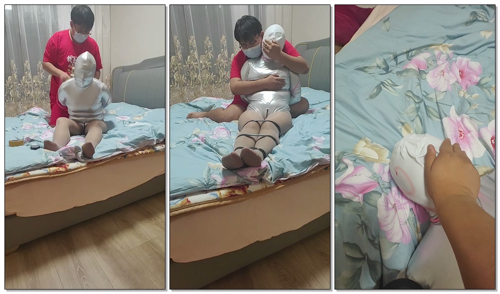 先带上口球,再穿上银色全包衣,脸上再套个泳帽,是个正常人都受不了