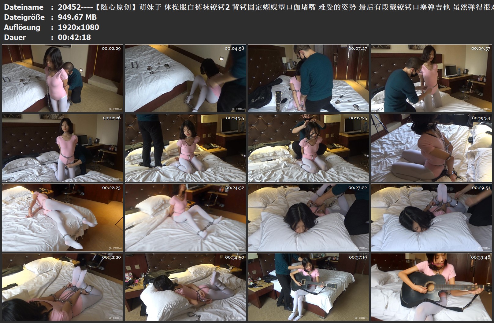 萌妹子 体操服白裤袜镣铐2 背铐固定蝴蝶型口伽堵嘴 难受的姿势 最后有段戴镣铐口塞弹吉他 虽然弹得很难听