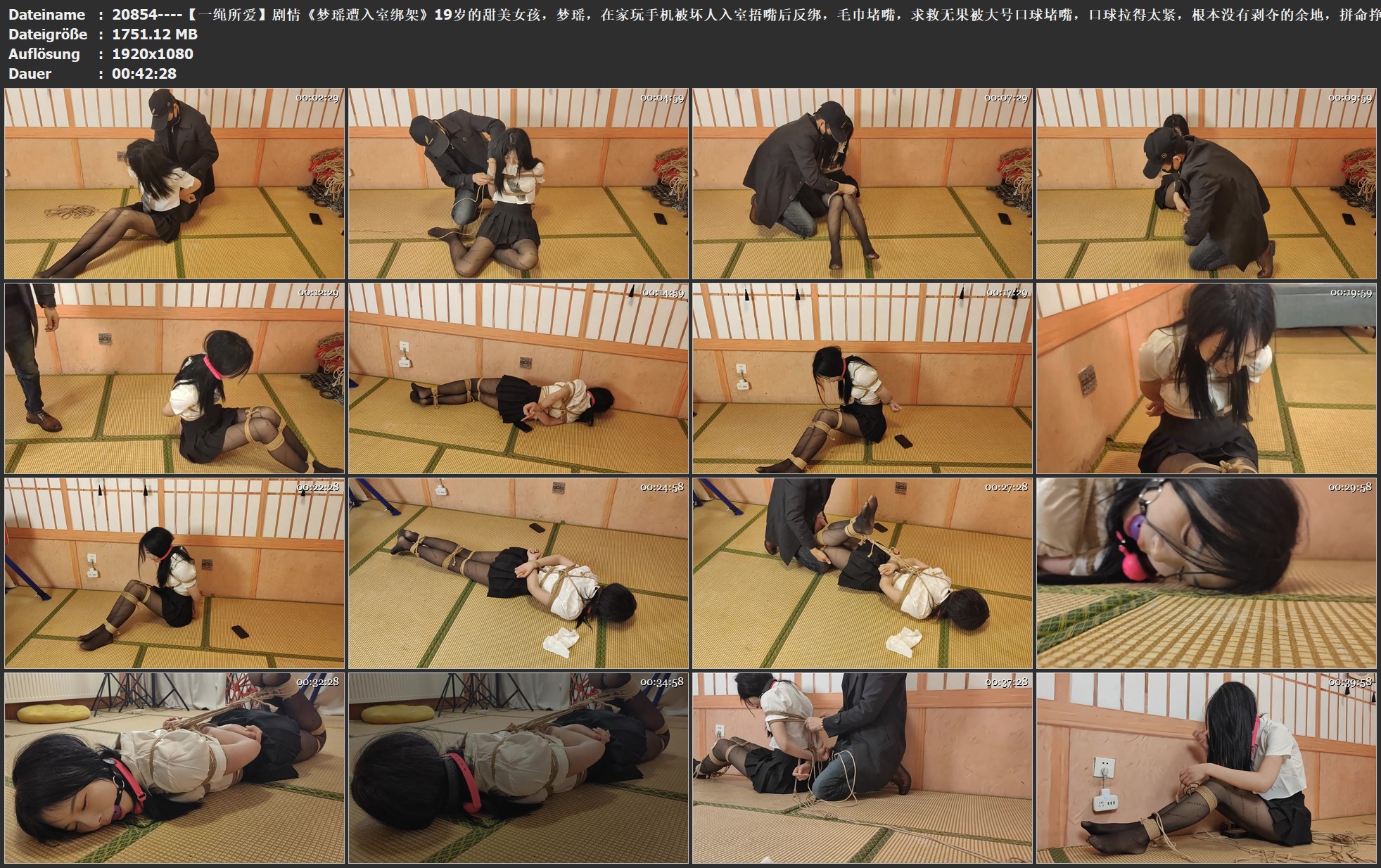 梦瑶在房间玩手机,被坏人闯入悄悄靠近,用毛巾捂住嘴,拖到地上嘴里塞了毛巾,被强制绑上日式,脚也被紧紧绑住,被绑的非常紧,只能试图移动拿手机求救,但是未成功,坏人来到梦瑶身边,威胁梦瑶拿开嘴里的毛巾,不要出声,坏人拿出梦瑶嘴里的毛巾,梦瑶便拼命求救,被坏人用大号的口球用力塞进嘴里,口球拉的非常紧,说不了话,只能拼命挣扎,试图挣脱绳子,因为太紧也无能为力,坏人也是怕梦瑶找机会逃跑,最后被绑上非常紧的驷马,无法动弹,不知不觉两个小时过去了,有人看见便帮忙解开了上身的绳子。才得以脱身