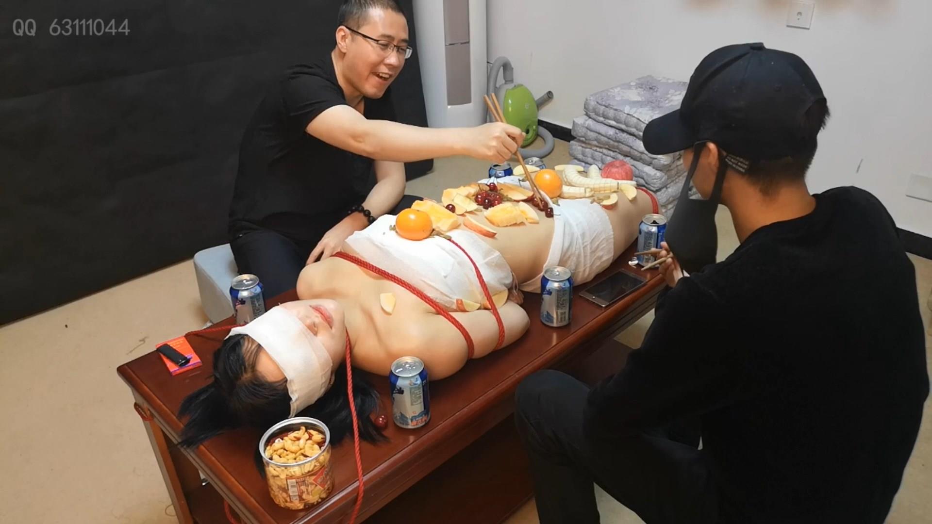 柠檬 纱布包裹 身上摆满水果 吃饭 喝酒 喂食 牙签扎 吃辣椒 各种戏弄