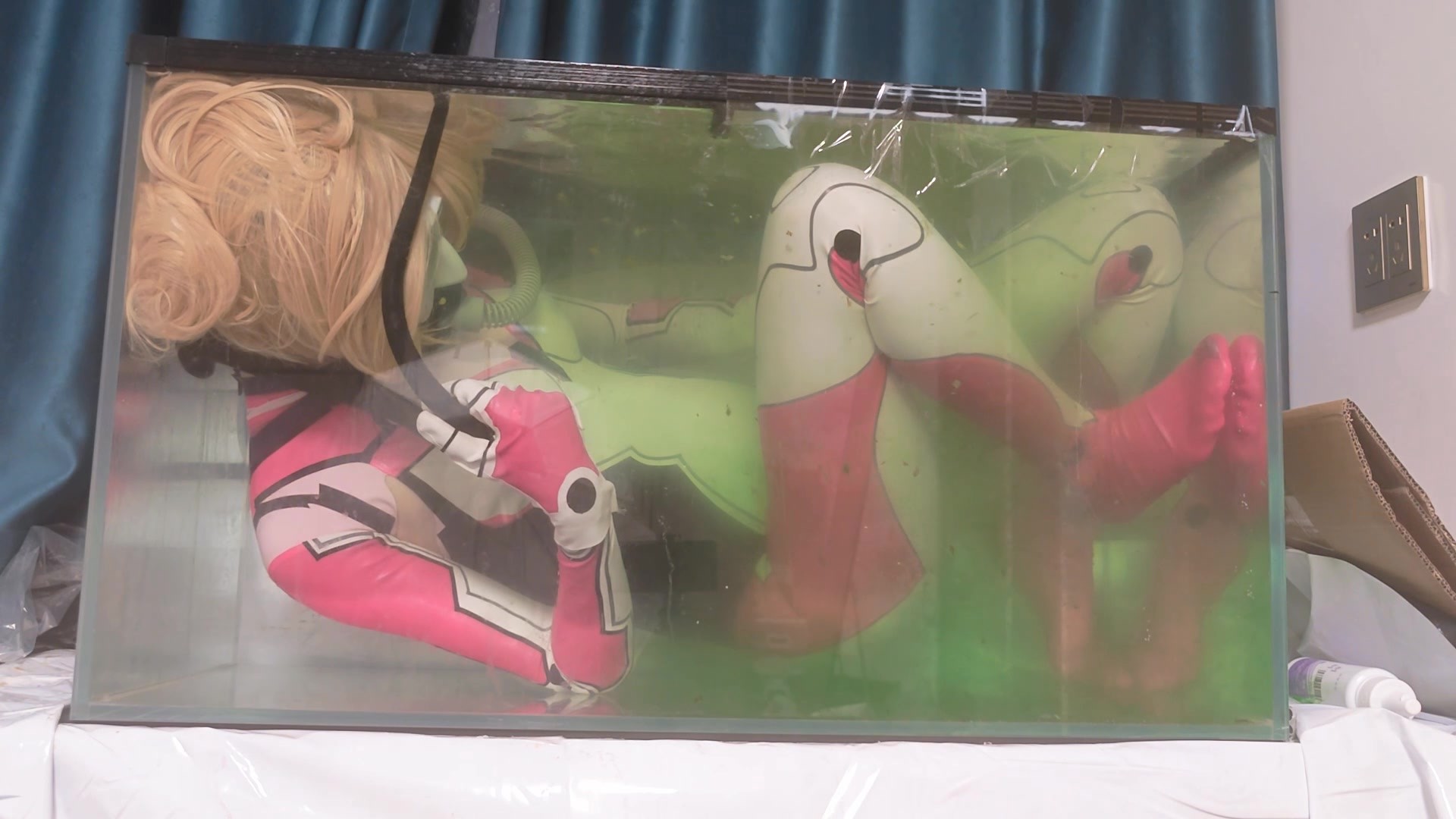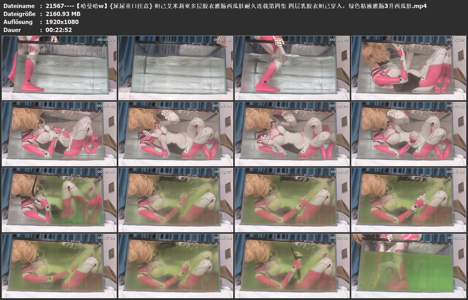 {屎尿重口注意} 妲己/艾米莉亚多层胶衣灌肠西瓜肚耐久连载第四集 四层乳胶衣妲己穿入,绿色粘液灌肠3升西瓜肚 [X_X]65厘米长度g塞密封[X_X]进行耐久试验 灌肠大肚状态已经持续了5个小时,忍不住了进入水中拔出g塞喷射 连带着粪便残渣也喷射进了水缸里,被粪水淹没