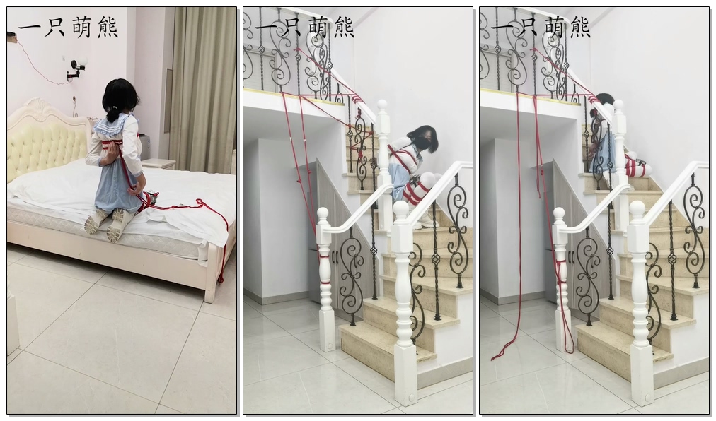 玩的最累的一次自缚!!!带上郊狼电击[X_X]贴片,然后绑个折腿缚,上半身日式,手腕收紧后绳头上锁,钥匙被挂了起来,想解开的话,就要这个状态上楼梯,每一阶楼梯都特别费劲,上到最上面之后把绳子解开,然后在一点点从楼梯挪下去,在下面捡到钥匙还要再上来楼梯,然后到最上面打开护栏上绳子挂的锁,这样才能让身上那把锁的钥匙落下去,然后再一点点下去,最后才能拿到钥匙解开身上的绳子,甚至我都想到了防止直接在上面扯绳子拿钥匙,所以吊着钥匙的绳子向下还有固定扯不上去,只能下去拿!!!设置脱缚难度的这种自缚好玩是好玩~~就是太累了