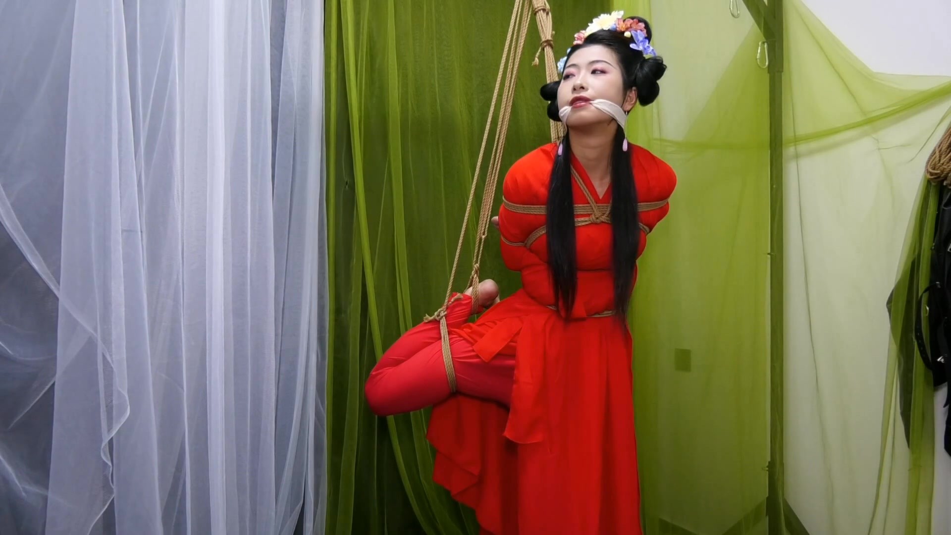 红色古装仙女装美女被勒嘴吊在空中摇荡