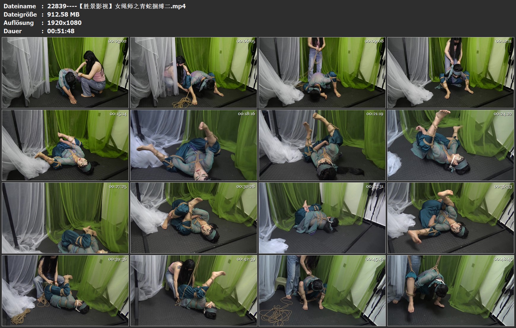 女绳师抓捕到青蛇后,将青蛇手脚M子型捆绑,在使用丝巾勒嘴,然后M字形吊缚,使其挣扎不开,牢牢捆绑住