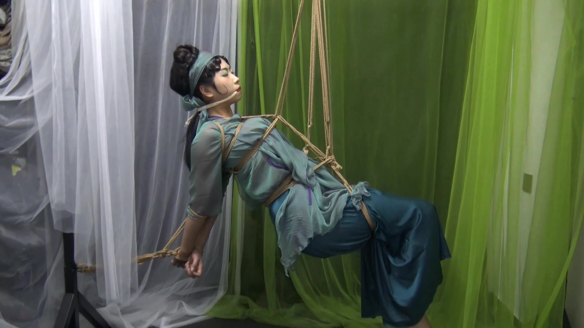 被女绳师抓捕到的青蛇,吊缚在空中,胳膊极限后拉,嘴巴勒上丝巾,呈后躺姿势在半空中挣扎,接着欧式极限后绑仍在地上放置挣扎