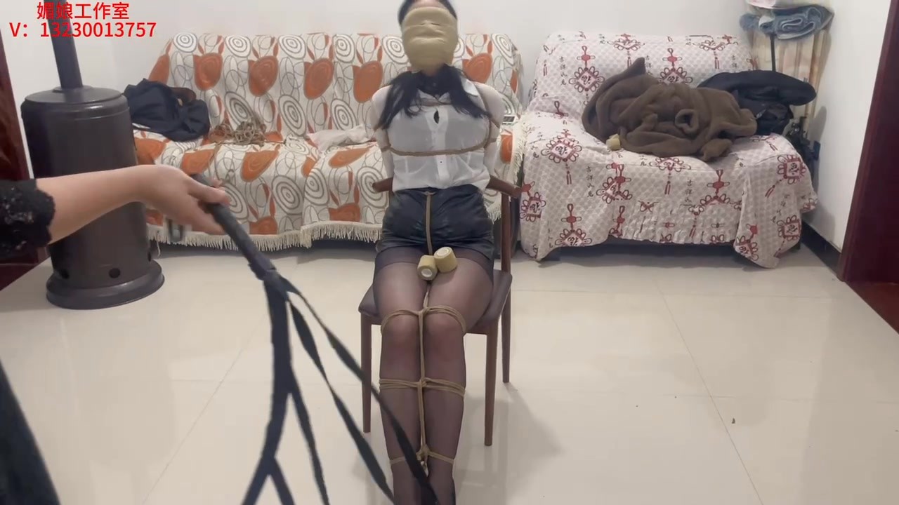 捆绑固定到凳子上,开始短丝袜塞嘴,一点一点用短丝袜把嘴填满,绷带封嘴,绷带缠眼睛