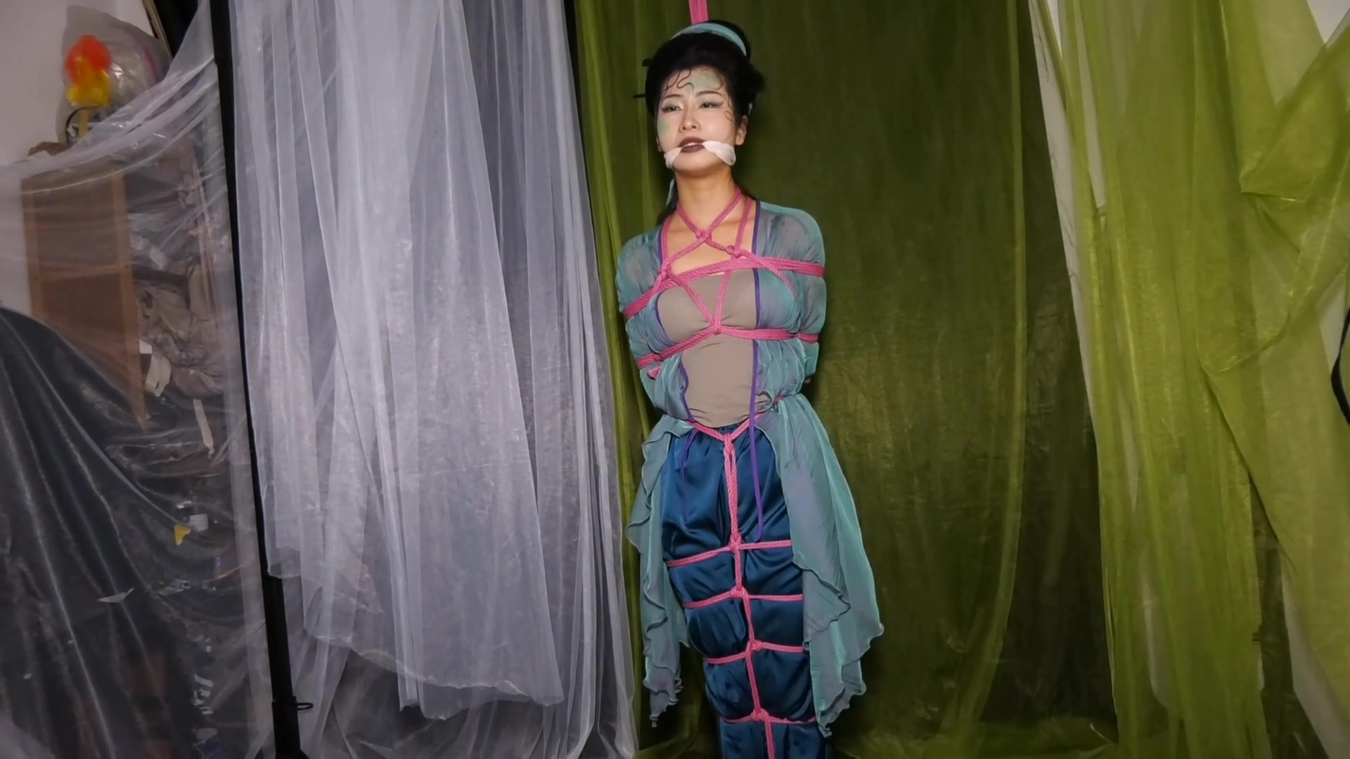 女绳师将抓捕到的青蛇捆绑固定住吊缚在空中