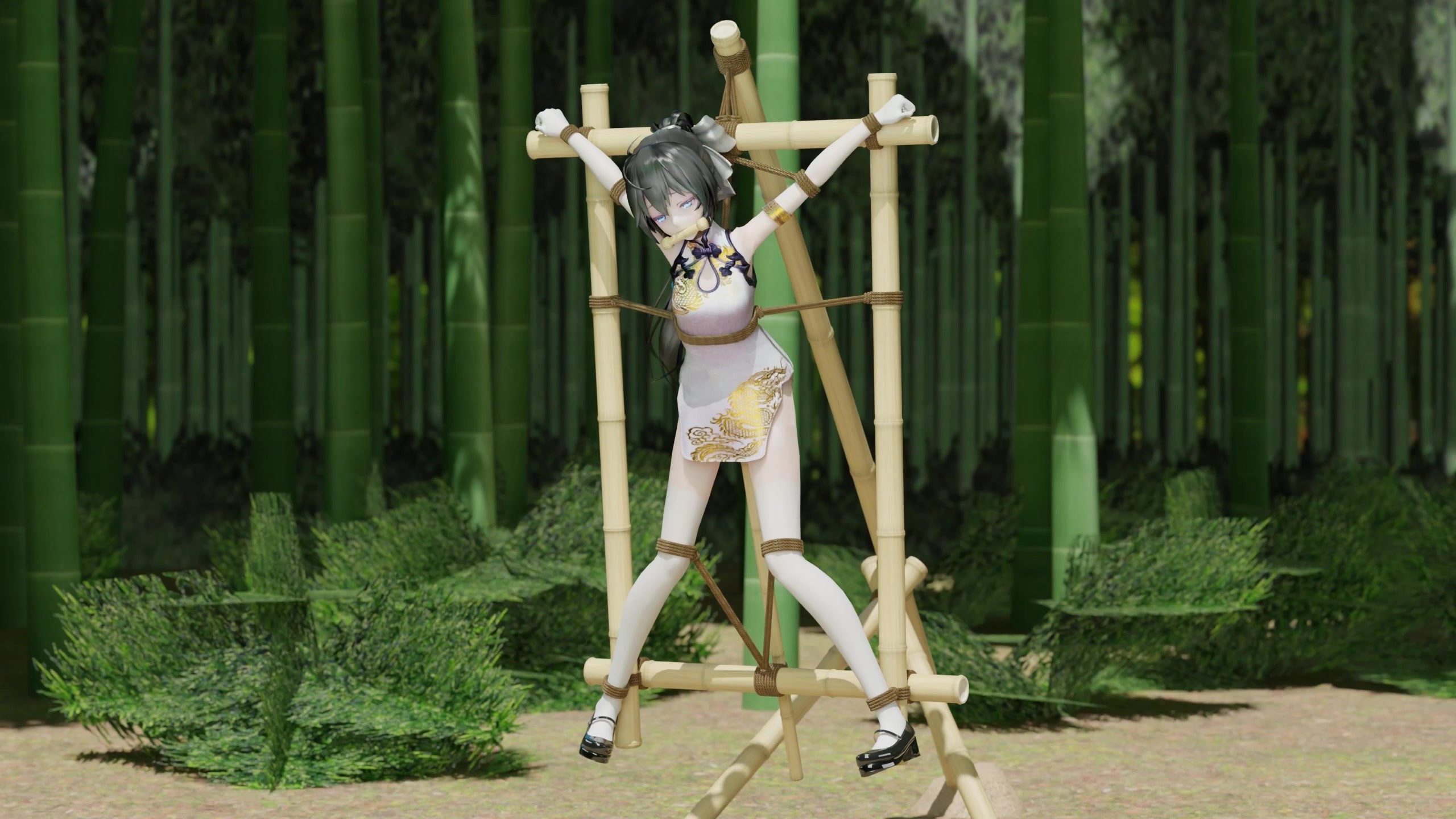 【3D动画】白丝旗袍中华娘 竹林晾晒 拘束架 吊缚 反绑 大字 口枷 放置 TD