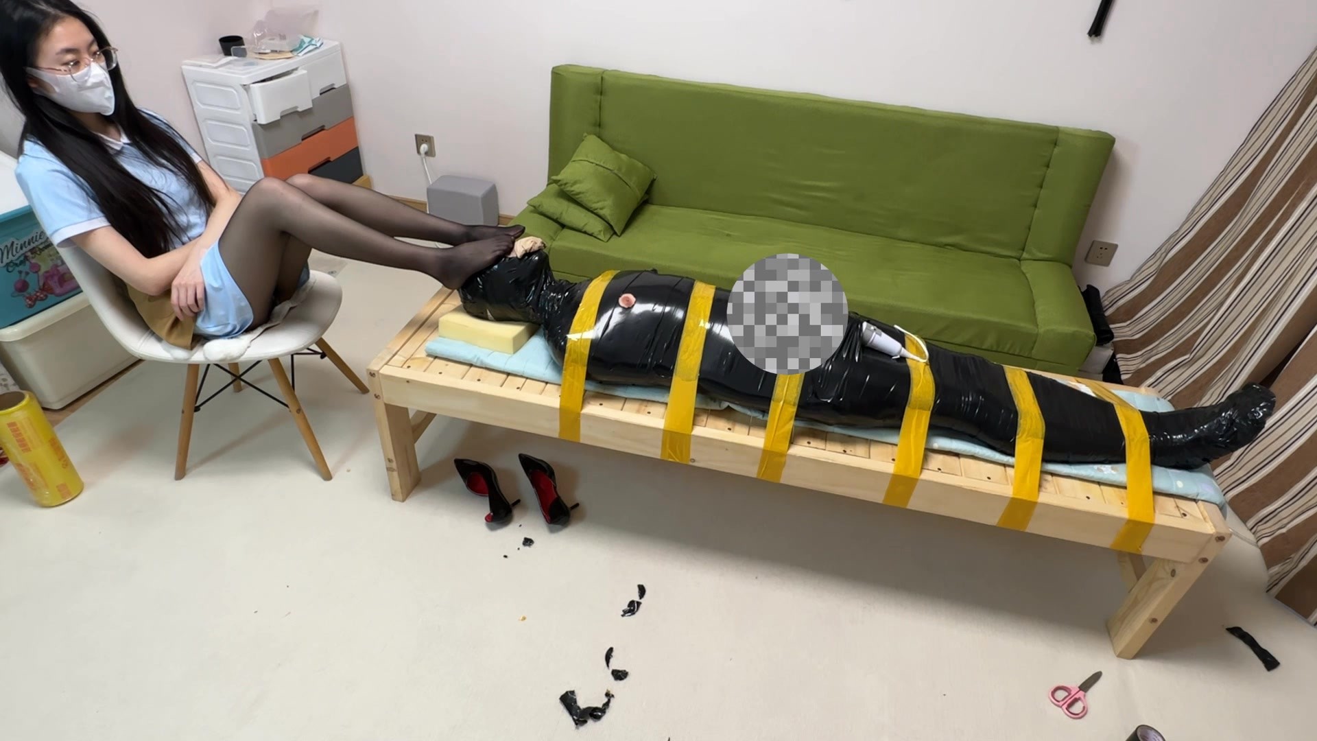 颜老师这一次要调教的男M已经被黑色胶带绑成木乃伊固定在了桌子上,为了不让男M叫出声音,颜老师拿来了早已准备好的一双肉色丝袜,颜老师直接将这双肉色丝袜塞进男M的嘴巴里面,被堵住嘴巴的男M无法反抗颜老师的调教,只能任凭颜老师的玩弄。含住丝袜以后,男M无法发出声音,颜老师用剪刀剪开了男M胸部的一部分黑色胶带,还有两腿之间的胶带,然后颜老师坐在一边的沙发上,抬起包裹着黑丝袜的玉足踩上了男M两腿之间的隐秘部位,同时再踩上男M的面部,玉足上下两个方向同时开始对男M进行肆意蹂躏踩踏,丝袜玉足的刺激让男M的身体很快就有了反应,颜老师拿来了两根[X_X]贴在下面对男M施加更多的刺激,很快男M就承受不住颜老师的[X_X]刺激,在颜老师的[X_X]下释放出来。除了丝袜玉足的按摩以外,颜老师也不忘用手指玩弄男M的身体,即便颜老师刚刚结束了一次调教,但是她并没有就这样放过男M,反而又拿来了一个特别的飞机杯和更多的丝袜,颜老师把丝袜盖在男M的脸上,还把丝袜塞进高跟鞋里面,然后用丝袜把高跟鞋固定在男M的面部,强迫男M只能呼吸高跟鞋和丝袜的味道,颜老师把男M两腿之间的隐秘部位塞入飞机杯里面,然后开始对男M进行高强度的榨汁调教玩弄,很快男M就在颜老师的榨汁下再次缴械投降
