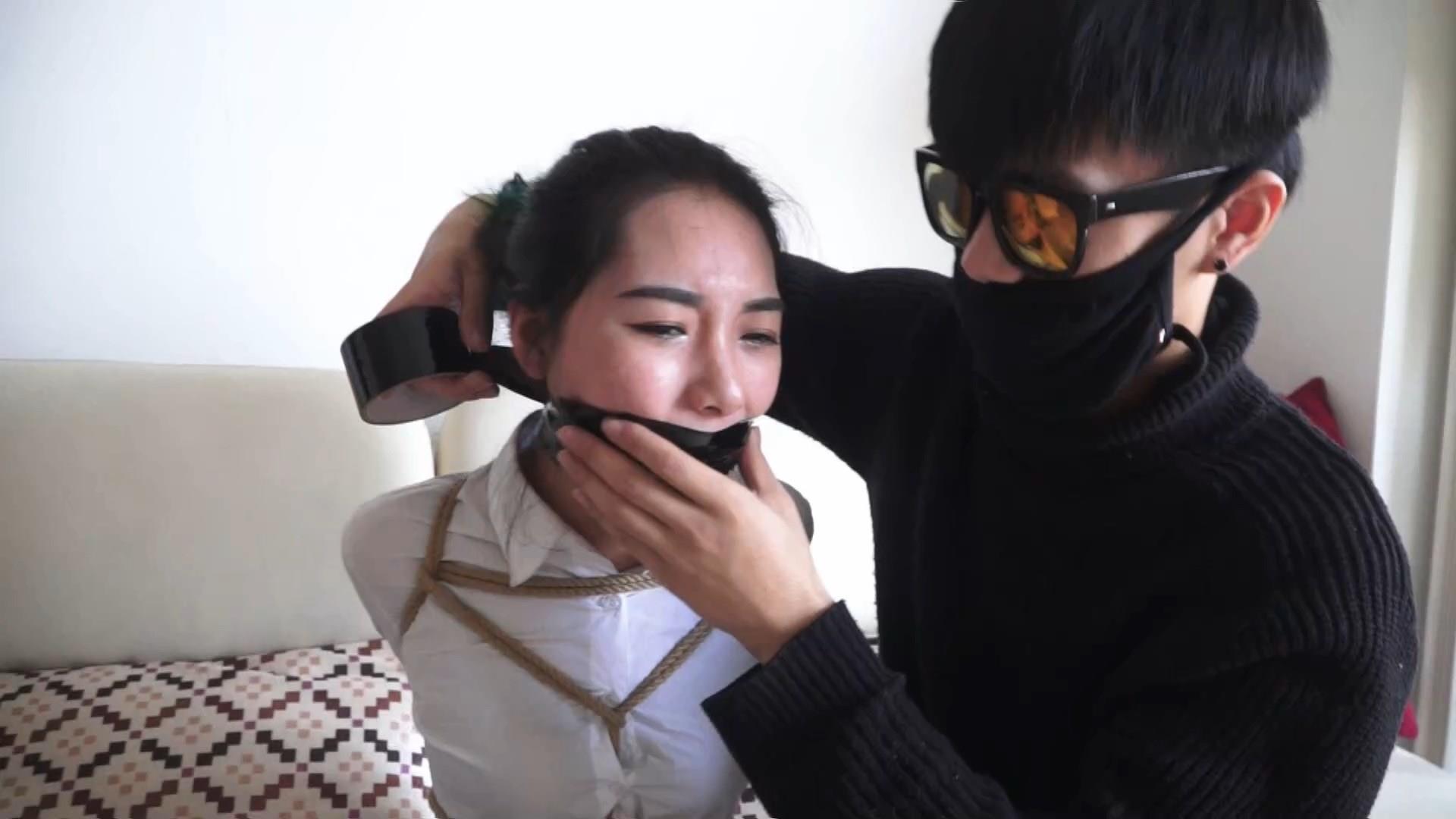 劫匪挟持董倩登场并捆绑董倩上身。绑完上身后,劫匪让董倩趴在沙发上,强行脱掉了董倩穿的肉色连裤袜塞到董倩嘴里。劫匪用连裤袜塞满董倩嘴之后,为了减小董倩发出声音,又用黑胶布和蓝色绷带封在董倩嘴外面。劫匪把董倩腿和脚并拢捆绑后离开,留下董倩呜呜呜剧烈挣扎。经过一段时间挣扎,董倩终于挣脱捆绑,一点点解除了嘴上封堵,终于解放了。