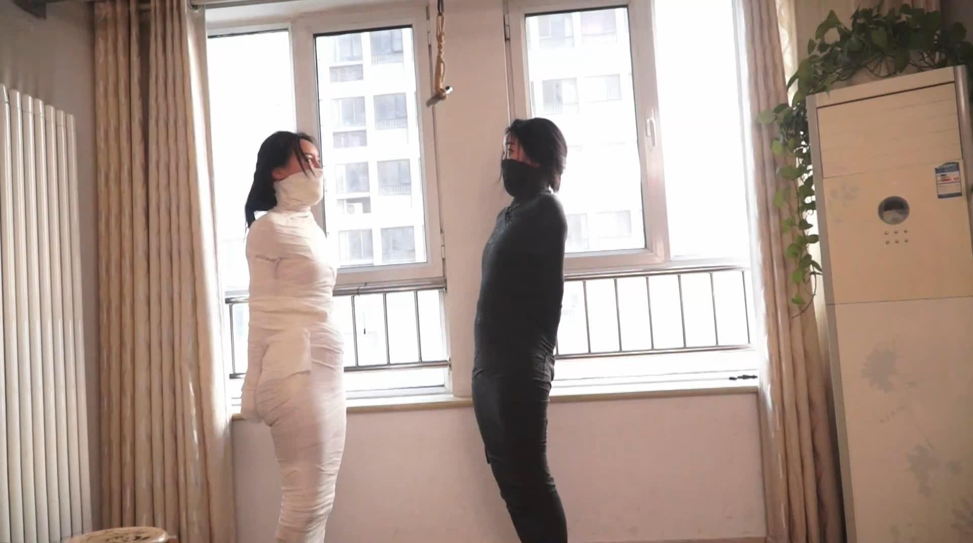 "上回说到2位美女被坏人迷晕并被捆绑成木乃伊,挣扎不能。 这是男人回来了,不知道他在搞些什么,他好像在客厅挂上了什么东西。 男人挂完东西就走了,这时2位美女才发现原来男人把一个小刀挂到客厅里。2个美女二话不说赶紧过来够刀子。 白色木乃伊美女根本够不到小刀,个子比较高的黑色美女赶紧想帮忙,但她平衡不太好,在费劲力气扭动半天之后才得以站起来。 让她们气愤的时好像是男人故意设计戏弄她们一样,她们用尽各种办法都不能把绳子解开。 漫长的时间过去,2位可怜的美女挣扎的满头大汗,小脸憋的通红。 2位美女几乎绝望的认定自己无法够到近在眼前的小刀,这快把她们气死了。 经过费力艰难的挣扎,白色木乃伊美女终于把腰部的绷带挣扎松了。 但她们发现自己居然白开心了一场,就算外面的绷带解开了,但她的手臂连同手掌也都被绷带包裹,握拳的小手根本什么都做不了,她根本不能帮她和同伴身上的拘束解开,甚至连小刀都够不到,也就是说她好不容易解开拘束,但却什么都做不到,急的可怜的美女呜呜直叫。 果然,没多久,男人会回来了,把她的手臂又捆绑了回去。 但这次男人没有停手,他好像还想加固捆绑的样子。。。。"