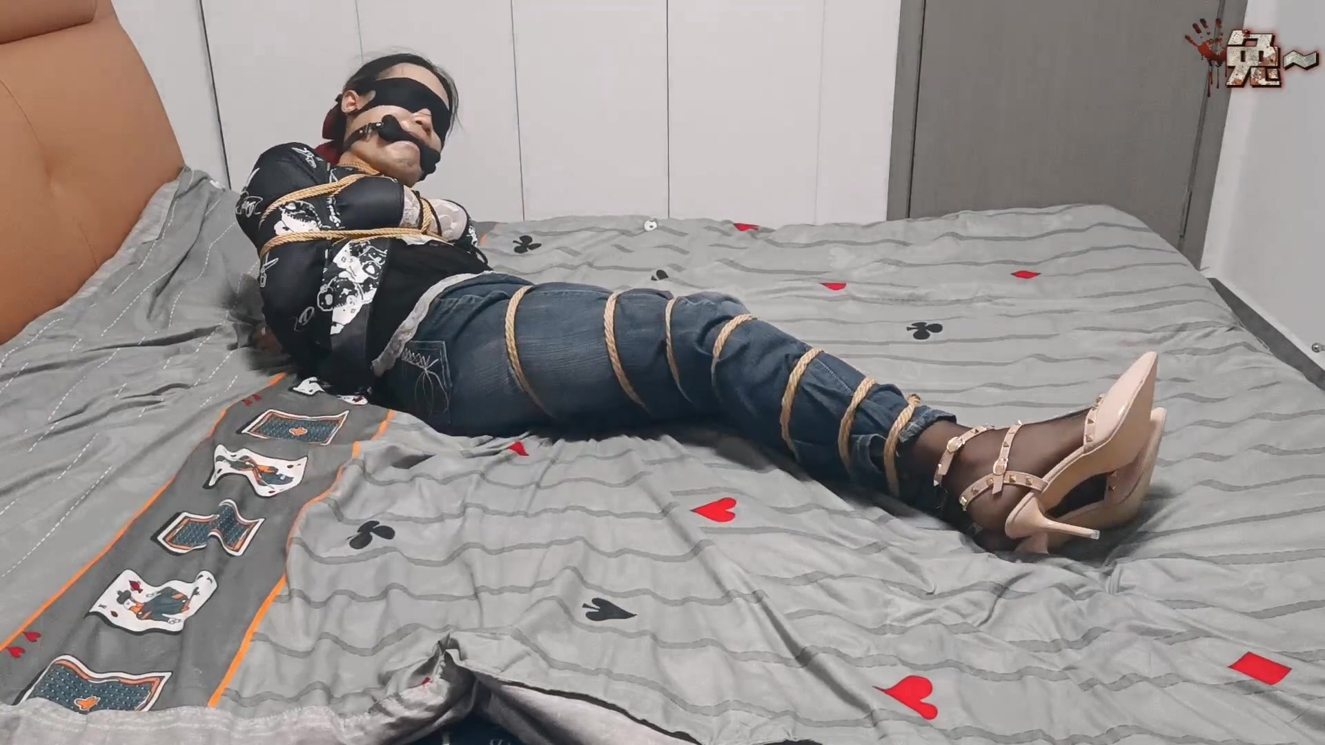 自娱自乐第13弹《裤里丝》 黑丝搭配牛仔裤再配上一双铆钉裸色高跟鞋 女仆装内搭➕黑色风衣。眼睛被蒙住,嘴里咬着骨头口枷双手反绑在身后,双腿也被紧紧的捆住,被放置在床上挣扎 ……最后被捆绑在椅子上,戴上耳机,耳机里发出不可描述的声音,口球丶[X_X]丶电击乳夹一个都不能少
