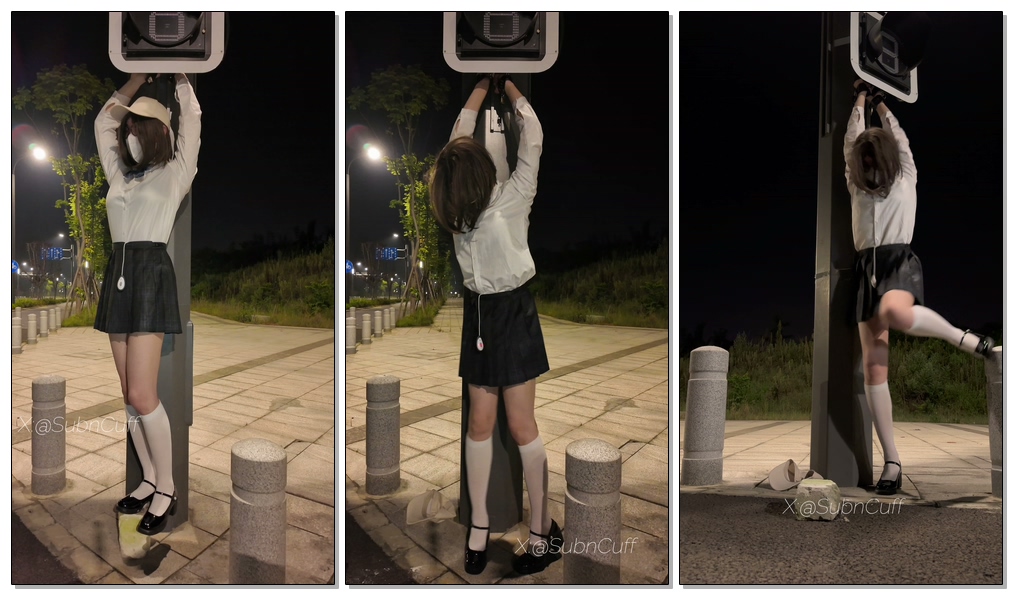 和上次一样 先踩着砖块用定时锁把自己吊铐在了路口的路灯上 然后踢开了砖块 这次的鞋跟没有上次高 手腕已经比较极限了 必须踮着脚尖才能缓解 中间试了一下可以站在两边柱子上 却也是很难受很羞耻的姿势 下来的时候又硬生生把手腕拉伤了