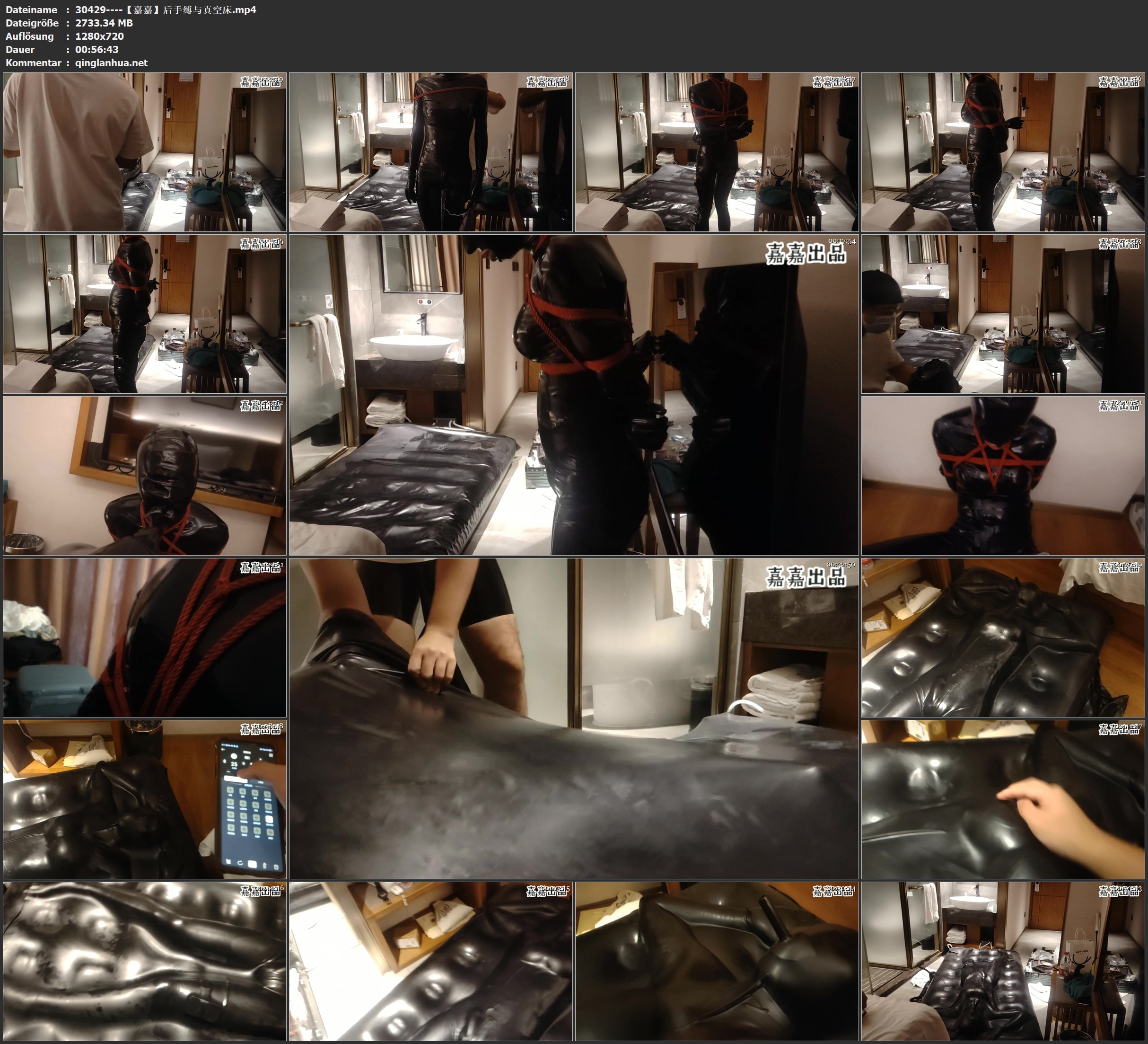 嘉嘉先是被主人用绳子捆了个日式后手缚,精致却又紧致的绳子将嘉嘉的小肚肚都勒了出来,两只手被绳子吊起让嘉嘉很快就手麻了,然后因为郊狼电量低还乱动个不停而被主人罚跪,用一条连着头套的乳胶裤子进行了惨无人道的护膝训练,仅仅是五分钟嘉嘉就挣扎着要出来,浑身因为缺痒而抖个不停,最后因为前两个任务都没完成而被主人放进真空床,真空床的胶皮紧紧包裹着嘉嘉,让嘉嘉动弹不得,后来将郊狼开至175,嘉嘉在床里抽搐不停,一边又进行训练,最后将嘉嘉玩晕过去了,嘉嘉多次乞求主人放出来,得到的只有抽气泵工作的回应,最后因为主人要出去而被封在真空床里一个晚上