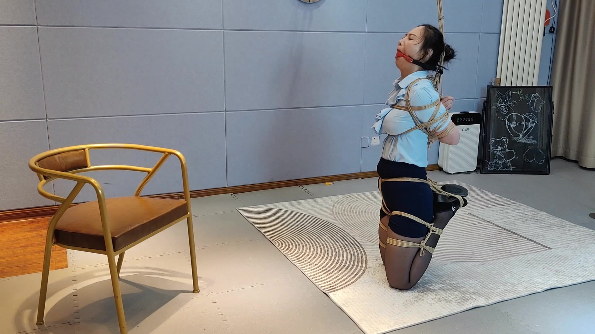 成熟的女性紫涵,穿上职业装更有韵味,配上黑丝布鞋很有年代感,双手被捆绑在背后吊的高高的,双腿折叠捆绑,跪在地上,口球堵嘴,只能跪着