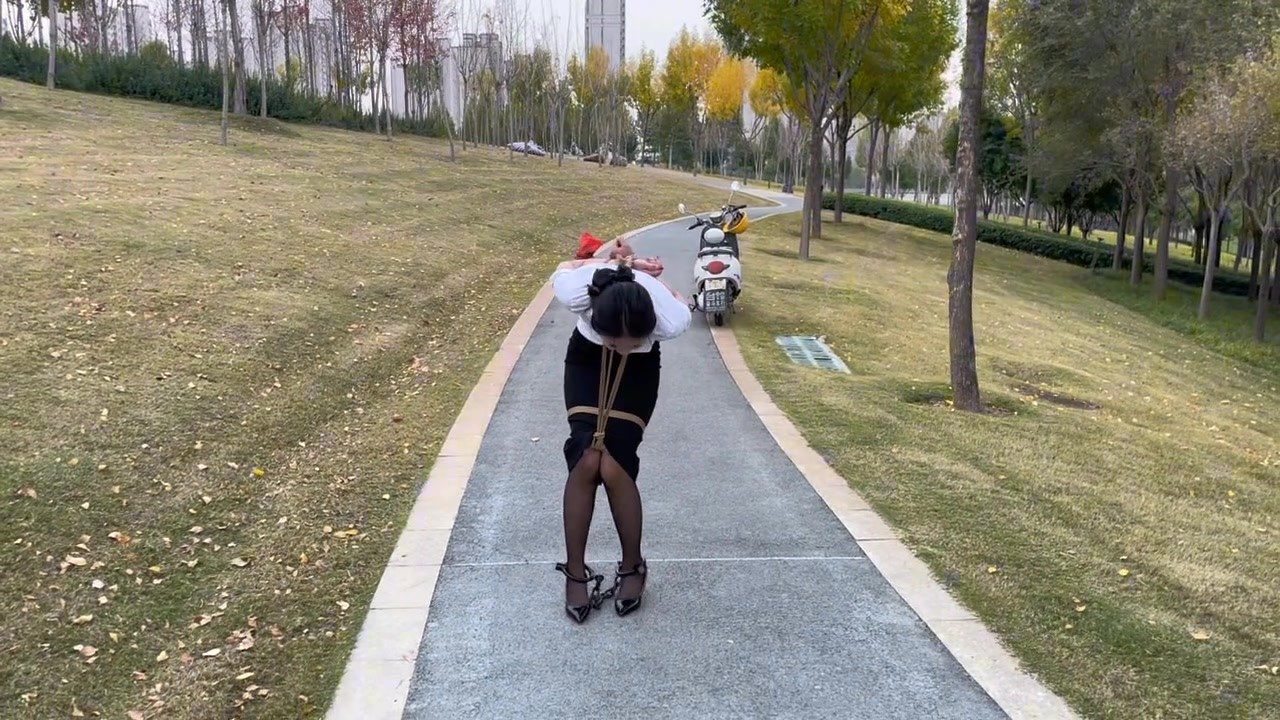 这次让妹子穿着一步裙黑丝高跟鞋带着脚镣五花大绑的户外公园行走,人来人往的看着妹子害羞极了,勒着脖子她非常难受还晕了