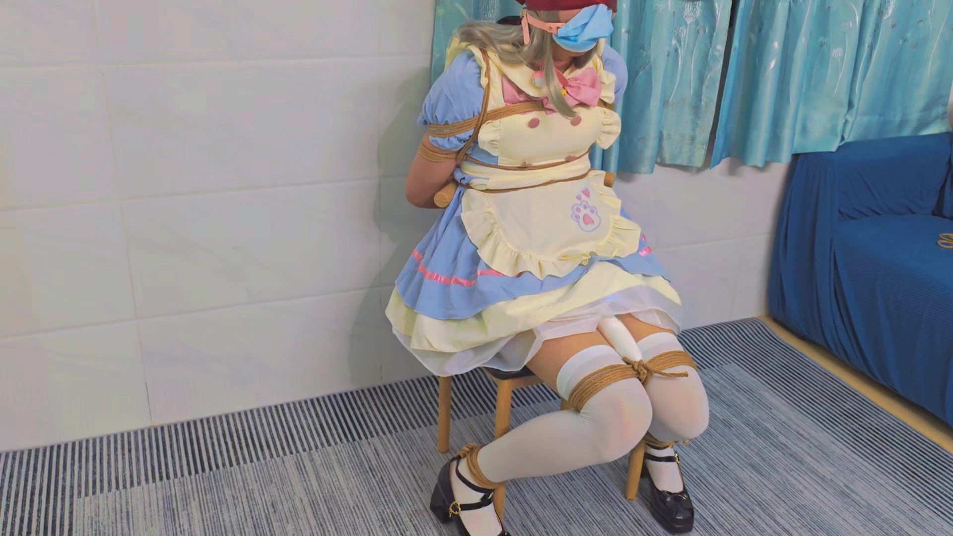 由于我心善,见不得这场面,出于人道主义,忍痛给m休息了两分钟,便又把M抱到了地上,再次绑了起来,还是驷马,绑上之后,也少不了[X_X]抵住刺激,当然头部三件套还是逃避不的。