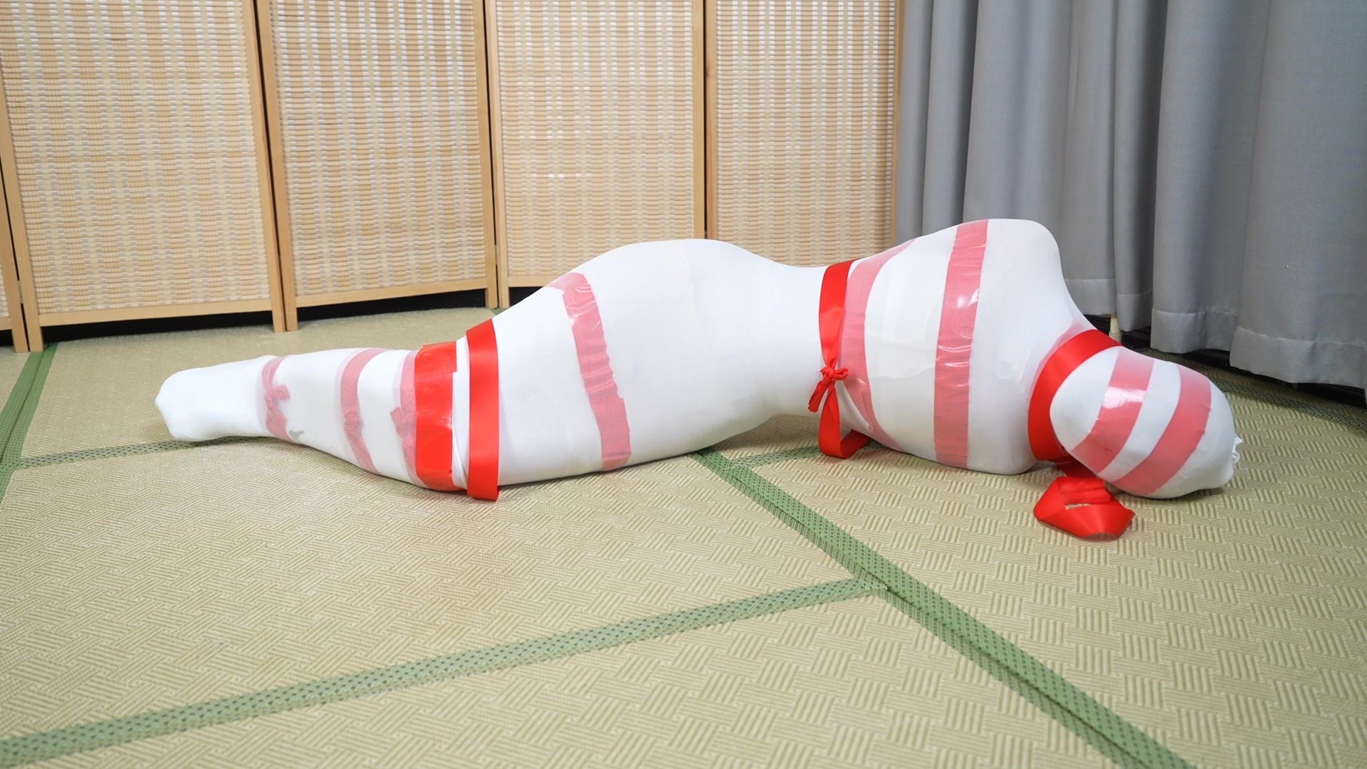 头上套多层连裤袜,戴上项圈并上锁,把两条腿包进一条长筒袜里