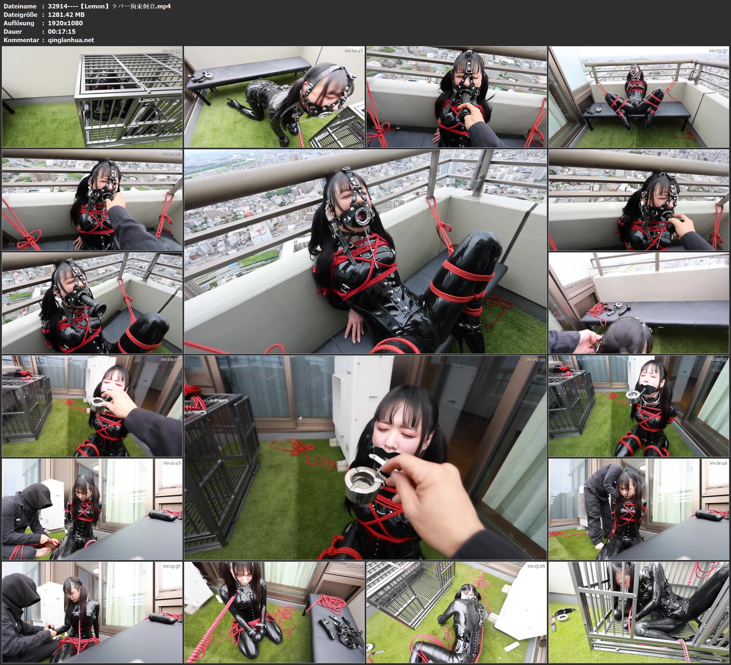 大晴天被主人从阳台的笼子里拖出来,分腿缚龟甲缚绑在长椅上,还被主人用假丁丁狠狠捅嘴嘴。