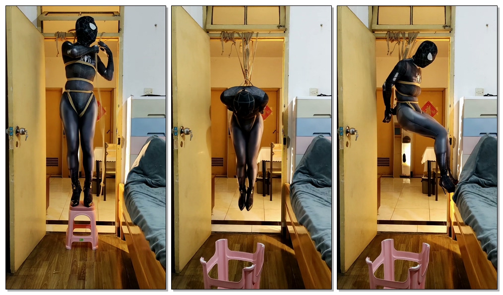 搬家时一眼就相中了这个门槛,吊点有了,那就可以开始吊缚了。穿上紧身衣战袍(给后来吊缚带来了很多麻烦)事先在身上做好三处受力点绳套,提前塞了6cm的gs,穿上10cm细高跟鞋上锁,带好锻炼器。接下来就是自缚吊缚了。用了20多分钟自缚,依次固定好胸上,肋骨,腰部三处吊绳,然后在手臂上套上直臂绳套,由于绳套做的太小刚套上手臂就麻了,为了安全还是去掉了。接下来带好手铐用定时锁锁好。然后踢开凳子,整个人都悬空在半空啦!愚蠢的吊在半空什么时候定时锁能开都不知道,还差点又给自己锁上加倍,下次一定要确定好时间了。第一次自己吊缚,受力点没有做好,重力基本都压在肋骨那根绳子,导致呼吸困难还很痛,锻炼器不断地折磨还有后面gs的强烈存在感,让吊起来的每一秒都那么折磨。
