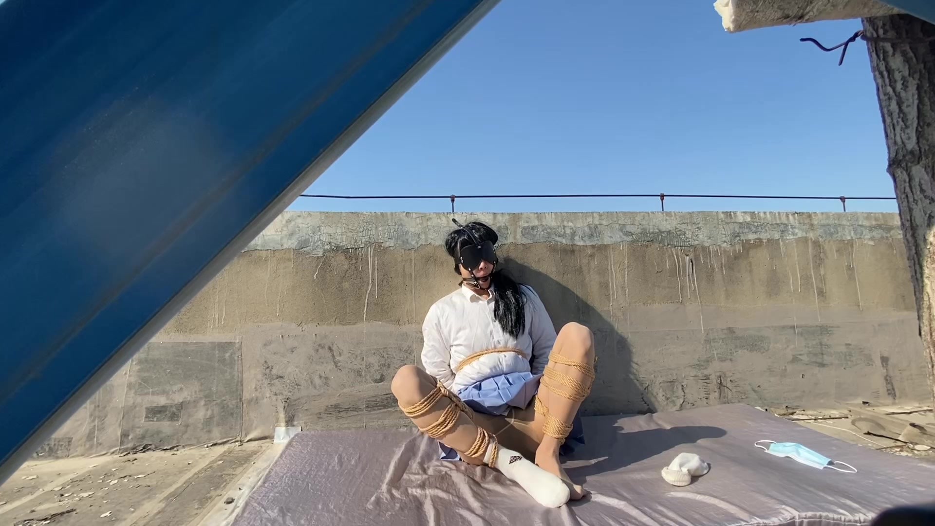 绑在楼顶放置晒太阳,戴上眼罩瞬间视觉被剥夺,内心恐慌不安,生怕被人发现,因为楼顶有很多人晒衣服晒被子,要是被发现可就真的社死了…不知道别人发现了看见这里被绑着一个女孩,穿着肉丝裙子,心中该怎么想…