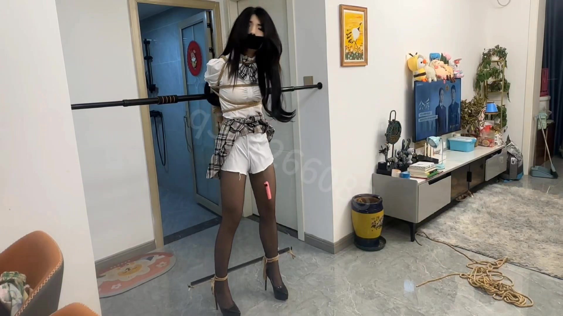 jk,黑丝,超高跟,极限欧式后手紧缚,固定好之后开始调教,,超长罚站放置强高,强制口舌呕吐,后入至失禁,,,过程有点煎熬,,喷一地都是,最后手里拿着那个气球是羞辱感的点睛之笔