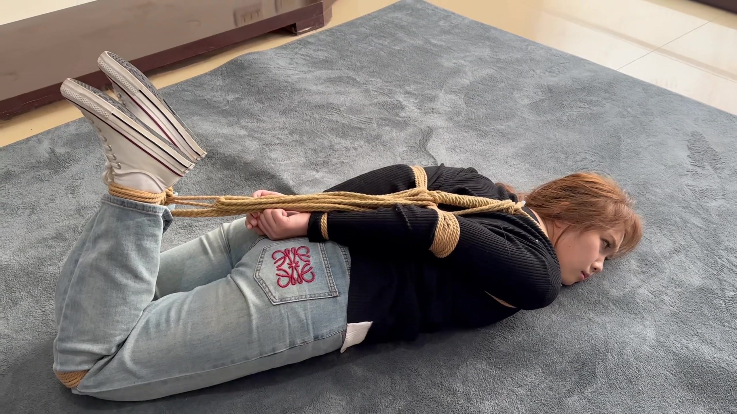 某天下班回家,女孩全然没有注意到身后跟着一个戴着口罩的劫匪,开门的瞬间劫匪冲上前捂住了嘴巴,抓住捂嘴的手激烈反抗却被劫匪警告,接着劫匪押着女孩走进了房间,推到在沙发上,接着拿出了绳子,女孩看到后说:你要干什么,你绑我干什么接着开始激烈挣扎起来,却没办法逃脱被绑匪捆了起来。捆好后劫匪说:钱在哪,拿出来吧。女孩说:没有钱了,都花完了。劫匪生气推了女孩一下不说实话是吧,老实待着吧。接着便自己去翻找柜子.女孩看劫匪在翻找柜子,没有注意到她便想偷偷逃走,可是没想到刚刚站起来便被劫匪看到了,看到他她想逃跑劫匪又拿了跟绳子捆住了腿脚绑成了驷马。女孩见状惊慌的说你要干什么,绑好后劫匪想继续去翻找财物,女孩被放置到原地