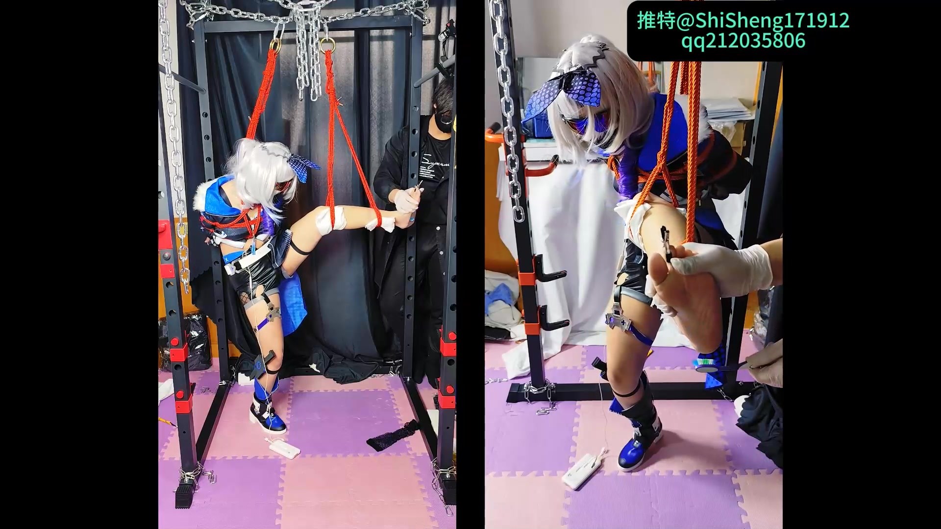 (女孩子!女孩子!女孩子!重要的事情说三遍!!!)崩坏星穹铁道银狼cos,(35码的小脚),分别有两个片段,《第一个片段》是银狼被绑住身体,单腿吊起来,双腿之间塞入[X_X],手指抚摸[X_X],棒棒顶着[X_X]折磨[X_X],接着是详细的脱下鞋子的过程,只留渔网袜,夹脚趾,挠脚心,之后将渔网袜也脱掉,用毛笔轻刷脚心tk,接着解开腿上的绳子,将渔网袜和鞋子都穿上,《第二个片段》是双手被吊过头顶,身体弯曲着,下面的跳dan依然没有被拿出来,先是不脱内裤用手和板子打屁股加抚摸屁股,接着轻轻的将银狼的短裤脱下来,只留黑色的内裤,再用手和板子打屁股以及抚摸