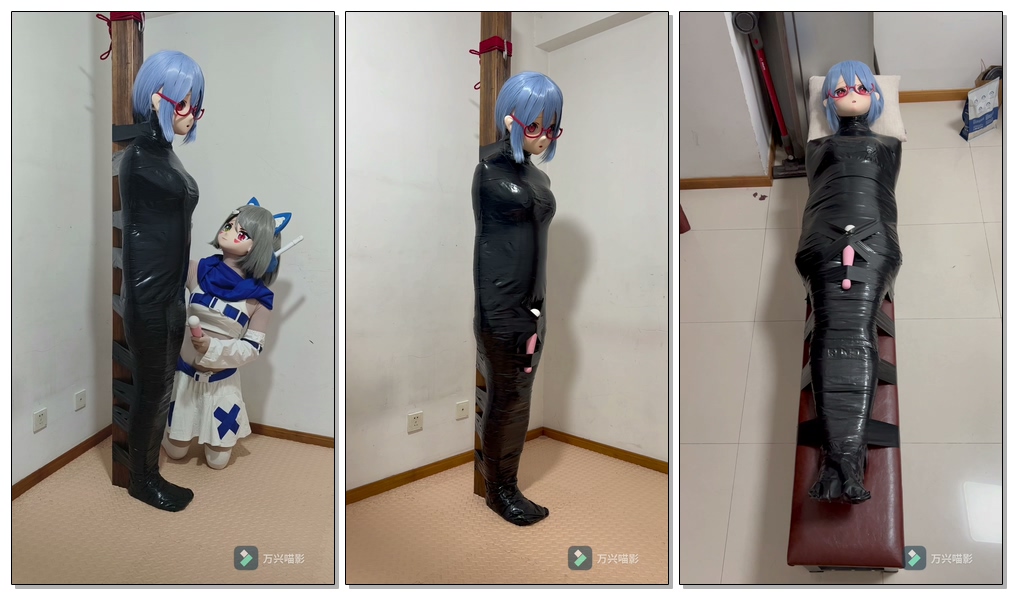 而这还只是刚刚开始,全包的天天和坚固的木柱紧紧贴在一起,一圈圈胶带将天天和木柱牢牢固定,而电动玩具则被胶带紧紧贴在天天的下身,任由如何挣扎都无法逃脱玩具的震动,牢固的胶带,光靠着有限幅度的挣扎,永远都不可能甩的下来。