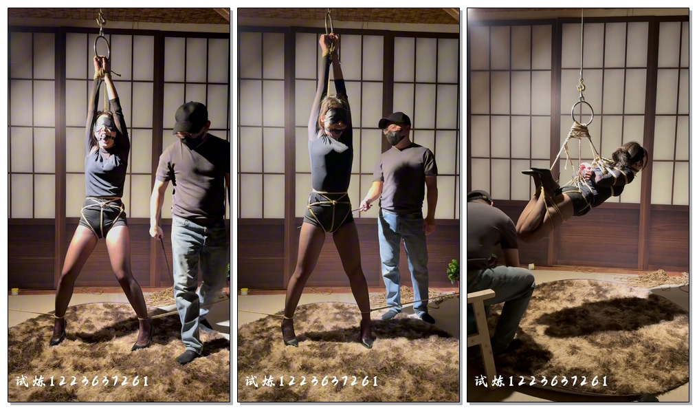 这期视频主角小欣穿上黑丝套装和10厘米的性感高跟鞋,双手举起来依靠升降器直接吊起,双脚分开分别用绳拉住无法并拢,没被吊过的小欣痛苦挣扎,嘴里被塞进去了超大口球只能呜呜呜。有一个很有意思的片段是把她放下来的时候她说自己可以解开手上的绳子,我说你试试吧不过要倒计时我会慢慢升起来,最终解脱成功还是失败?还有两个驷马吊缚的片段,发现过年回来小欣的耐力提升了不少,看来可以解锁更多的姿势了