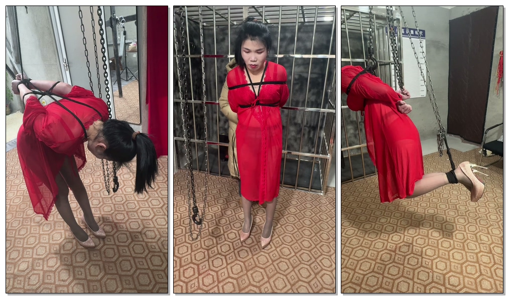 【皖北绳艺】某手几十万粉丝网红、白衬衫、高马尾、红底高跟。为艺术献身,铁笼里被囚、哭的梨花带雨!!!